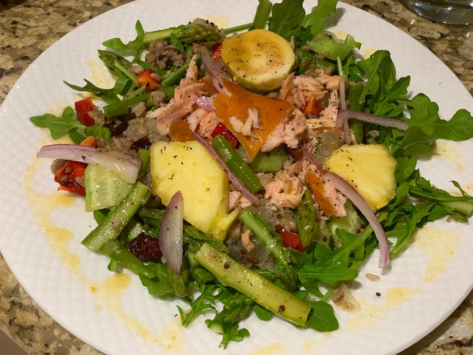 Заправка - лимонный сок, мед, дижонская горчица, соль, перец. Я просто сбалансировала лимонный сок и мед, в пропорции, чтобы кисло-сладкий получился и доавила дижонской горчицы по вкусу. В салат положила все, что было в холодильнике. Смесь из злаков из АЛДИ, аругулу, вареную спаржу, огурец, сладкий грейпфрут, ананас, гуаву, сушеную клюкву, сладкий синий лук, лосось холодного копчения из Костко и заправила все по вкусу. Вкусно получилось