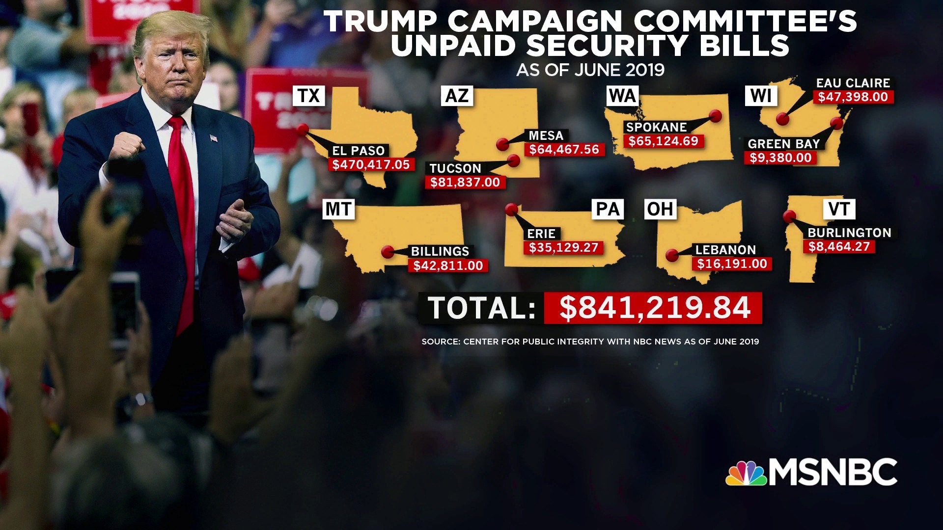 Trump campaign's unpaid security bills as of June 2019, according to a NBC News /Center for Public Integrity report. https://on.msnbc.com/2OK4nAo