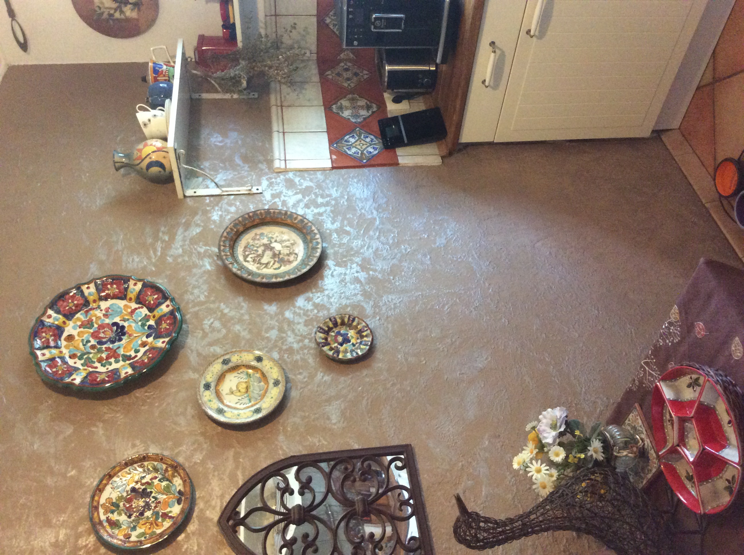 Раз уж тут делятся своим народно-посконным творчеством, покажу свою любимую псевдоитальянскую кухню- мы с мужем любим средиземноморскую кухню(в смысле, еду), к тому же сторона северная холодная, поэтому потянуло меня стремительно на юг.... Поскольку все работы делала сама- шпаклевала все потолки-стены, клала плитку, то никто мою фантазию не ограничивал)) Мебель- самая дешевая икейная, раб. поверхность- промасленный дуб. Плитку заказала в Испании, но это итальянская серия. Сложнее всего было с фактурной стеной- пробовала несколько вариантов- полихромные, с имитацией старой итальянской стены- беж-терракота, в итоге уже полностью готовую стену перекрасила- рискнула с шоколадом, а выпуклости на штукатурке обработала просто ладонью, смоченной в перламутровой глазури, в сочетании с тарелками, мне кажется, получилось не очень мрачно...вот)))) ПС Утка поселилась на столике случайно- села туда и больше не слезала...а тарелки появляются во время путешествий