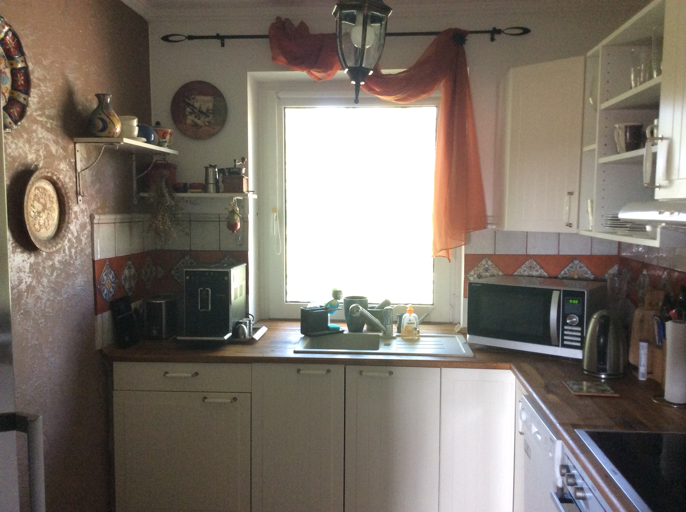 Лилия писал(а): Раз уж тут делятся своим народно-посконным творчеством, покажу свою любимую псевдоитальянскую кухню- мы с мужем любим средиземноморскую кухню(в смысле, еду), к тому же сторона северная холодная, поэтому потянуло меня стремительно на юг.... Поскольку все работы делала сама- шпаклевала все потолки-стены, клала плитку, то никто мою фантазию не ограничивал)) Мебель- самая дешевая икейная, раб. поверхность- промасленный дуб. Плитку заказала в Испании, но это итальянская серия. Сложнее всего было с фактурной стеной- пробовала несколько вариантов- полихромные, с имитацией старой итальянской стены- беж-терракота, в итоге уже полностью готовую стену перекрасила- рискнула с шоколадом, а выпуклости на штукатурке обработала просто ладонью, смоченной в перламутровой глазури, в сочетании с тарелками, мне кажется, получилось не очень мрачно...вот)))) ПС Утка поселилась на столике случайно- села туда и больше не слезала...а тарелки появляются во время путешествий Лилия , очень красиво , тарелки обалденные и все подобрано с любовью, смотрится так гармонично , девочки, я завидую белой завистью тем, кто может своими руками такую красоту создавать Просто молодчинки здесь все, а я любуюсь