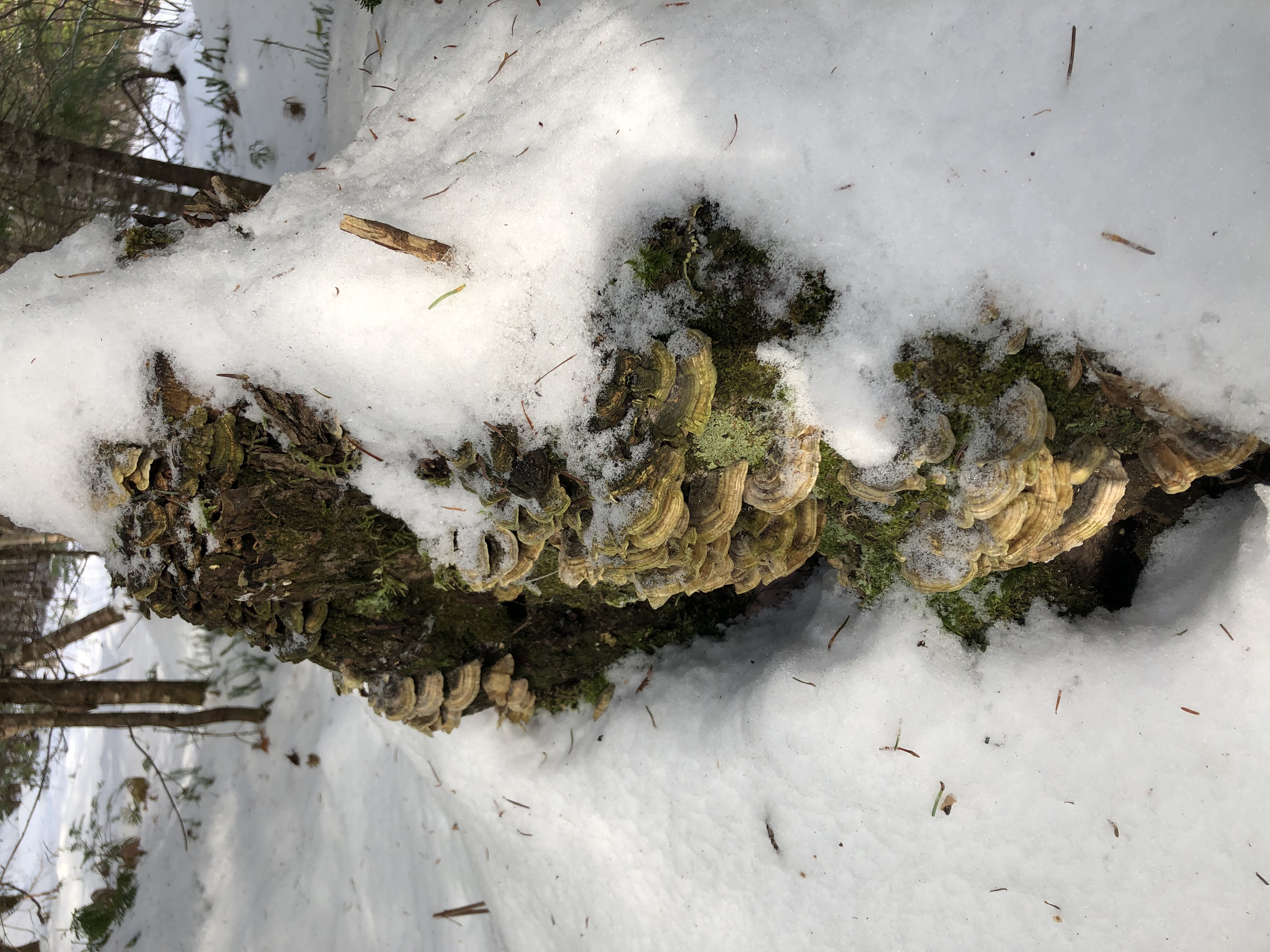 Ещё набрела на пень, как я предполагаю, с индюшкиным хвостом - Turkey Tail - траметес многоцветный - trametes versicolor. Сложно идентифицировать сейчас, трутовик высохший и замёрзший. Буду ждать лета, чтобы побольше собрать этот очень ценный гриб.