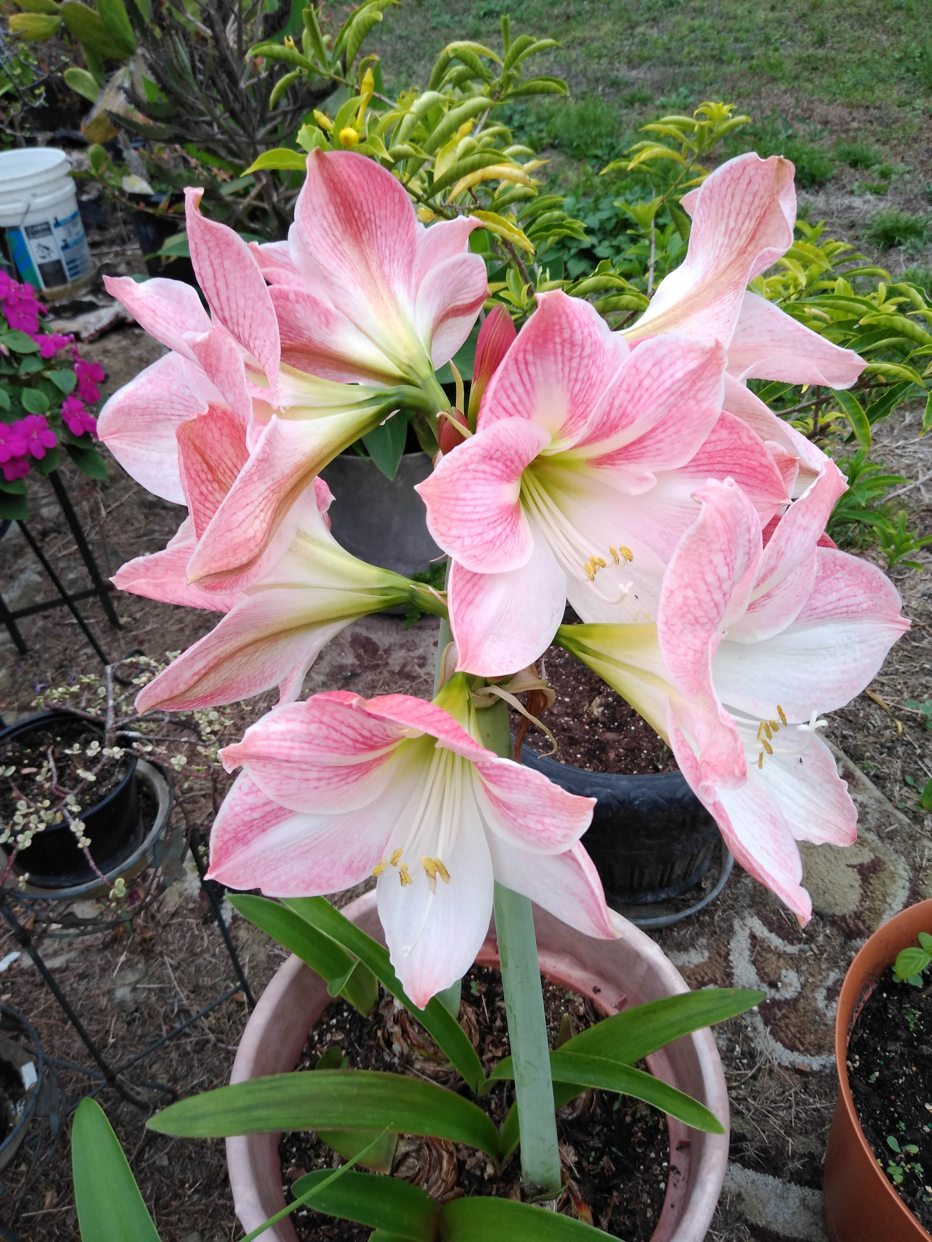 OklaXoma писал(а): Мамик, классные амариллисы! Первый вообще невиданного цвета. Белый тоже необычный, целый букет.да и последний пышный какой. И ведь в горшках! Ты их пересаживаешь с какой-то регулярностью или годами в одном грунте? А детки появляются? у меня в открытом грунте они, детки нарастают очнеь неторопливо. Орха очнеь впечатляющая! В этом году перед христмасом в волмарте продавали амарилисы в горщках. Знаете такой набор - высыпи из пакетика труху, засунь луковицу и залей водой. Разных цветов. Я парочку взяла. Вот тот первый как раз их этой серии. Белый это там две стрелки, на каждой по 6 цветов. Цветы махровые, крупные и тяжелые. Пришлось привязать к палке иначе падали. Вот и получился букет. У меня все в горшках. Пересаживаю раз в три года, как деток нарастет куча и уже места нет.