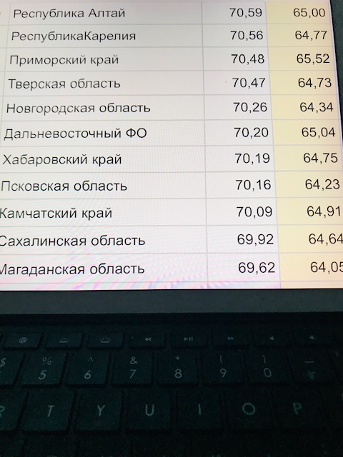 2018 год, желтая колонка мужчины. Ну в сказочной Москве само собой повыше 74. Ну так и смертей больше в Москве, где так скажем по российским меркам долгожителей больше.