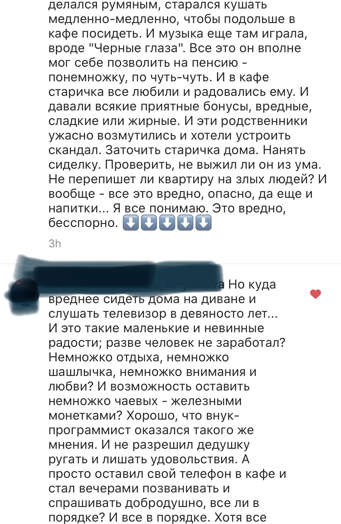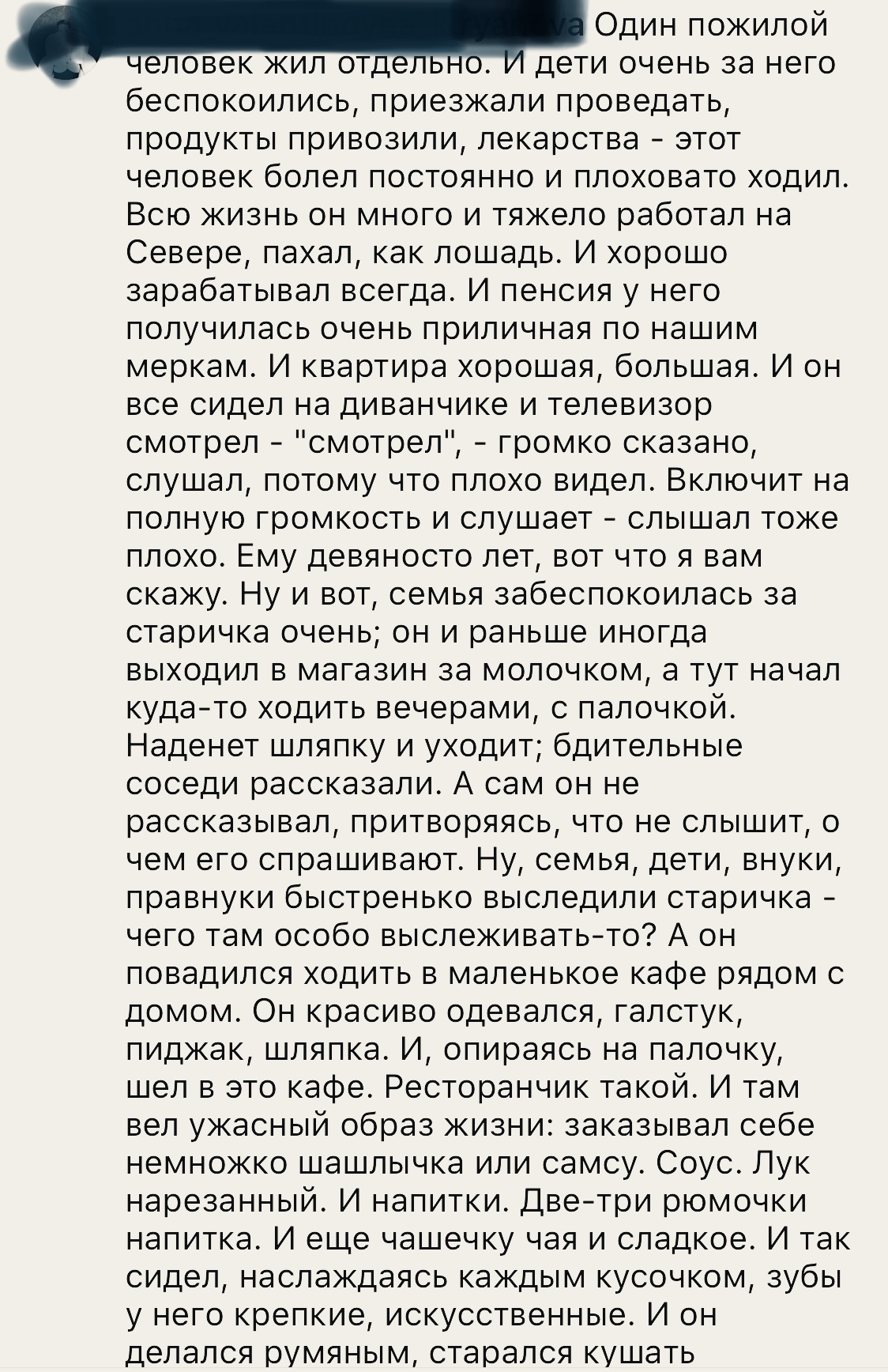 Вот я со своей приятельницей по ресторанам хожу когда приезжаю. У нее пенсия 11200. И платье она себе всегда новое покупает на день рождения долларов за 150. И празднует его всегда в ресторане с размахом. По отпускам правда не ездит, за границей вообще не была. На этом я могла бы присоединиться к закатившим глаза и поющим осанну шикрному образу жизни пенсионеров в России :c_laugh И я даже не соврала ни слова, я только умолчала, что у нее две квартиры, которые она сдает, дача и зимой подрабатывает. Другая знакомая тоже очень радуется, когда я приезжаю, а то ей не с кем ходить в ресторан, подруги не любят (читай не могут позволить) ну этой с пенсией крупно повезло 37000, она на 9 лет старше и в какой то хитрый расчет попала в 2014 м году И машина у нее киа новая. Ах да, чуть не забыла, кафе у нее еще в центре курортного города и зять депутат и местный царек :c_laugh