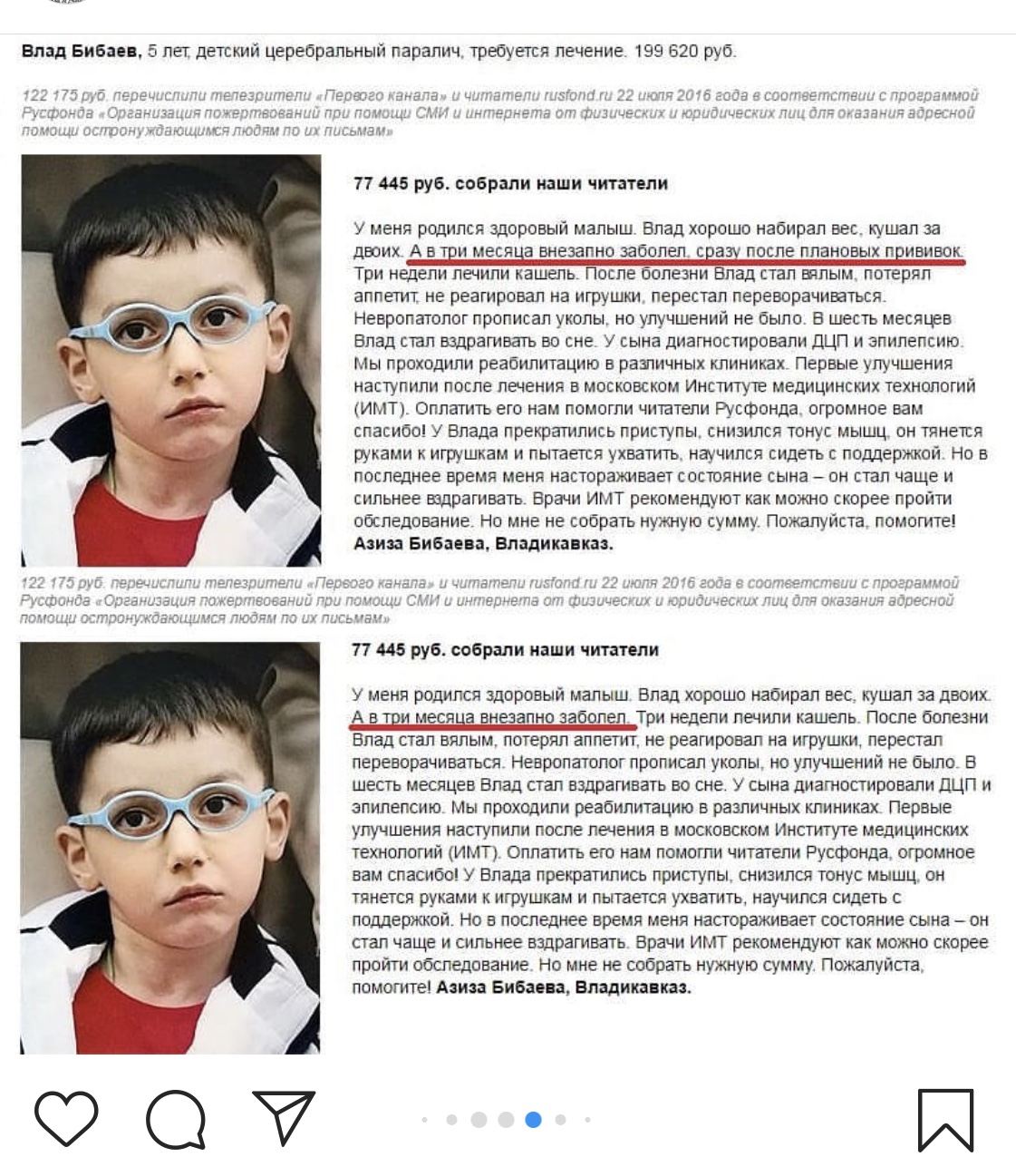 Цитата: А тебя прям 1000000 лично знакомых и у всех караул Give me break Sounds like a bullshit Я тоже знаю многих семей с маленькими детьми в калифорнии и все у них нормально у детей проходит и у меня тоже Слава богу Хожу на один мамашкин форум там у некоторых такие же истерики С этими прививками  А сколько разводов иза разных взглядов родителей  [/quote] Лада , да , у меня действительно есть много знакомых пострадавших после прививки . Это не единичный случай. Началось все с того что 15 лет назад , моя Соседка - в одном подъезде жили , я видела ее сына с рождения , поделилась , что сын стал аутистом после вакцинации . До 1,5 года мальчик развивался по возрасту, говорил слова , интересовался игрушками , контактировал с другими детьми и родными . В 18 месяцев после ревакцинации , сразу в эти же сутки был долгий плач, наступил регресс, пропала речь, появились все признаки аутизма . В 3 года был поставлен диагноз. Я бы не поверила; если бы не видела мальчика с рождения в нашем дворе . Это была самая первая история. 2) у моей Няни был один из внуков с заболеванием эпилепсия . После вакцинации «заработал» эпилепсию. Утром была вакцина , ночью первый приступ , теперь они всегда . Приступ был в год , ему уже больше 4х. Приступы продолжаются. 3) У меня была стилист , , у неё дочка стала аутистом тоже после вакцинации . Она судилась очень долго. Доказала что вред был нанесён после вакцинации , девочка не реабилитируемая. Очень тяжёлая форма аутизма. Получила компенсацию от увечия после вакцины , 30 тыс рублей , ( в России такие выплаты ) и государство ей выделяет ежегодные путевки в бесплатные реабилитационные больницы на море. 4) Далее , первая подруга в сша ходили на ESL , аналогичный случай . Первый сын стал аутистом после вакцины в 18 мес . Полный регресс потеря речи . Вторую девочку не вакцинировали , с ней все впорядке . Потом через несколько лет ещё познакомилась с 2 девушками , у детей после вакцинации аутизм , эпилепсия . Ну и встречала тех , у кого диабет после вакцинации и асма . Еще у одной знакомой ранее упомянутой тут , у дочки после вакцины отнялись ноги на 2 месяца . Ты не встречала, или повезло или ты не внимательная или нет в твоём окружении мамашек. В моем всегда были. Я человек любопытный , всегда спрашиваю , общалаюсь. Иногда могу спросить очень личные вещи . Многие люди не спрашивают и не интересуются , а что случилось, почему так . Да и вообще , тему вакцинации обсуждают не многие . Слишком уж эта тема щекотлива . Мало родителей которые сами начнут вам рассказывать о проблеме . По поводу последствий , 001 % полный бред . Даже когда тестируют вакцину , почитай научные исследования, на каждую на вакцину у 3-4% детей сильные реакции , побочки. Но это не считается фактором риска , вакцина все равно считается безопасной . Нет научных исследований которые наблюдают здоровье детей через 2-3 и 5 лет после вакцинации . Вакцины тестируются на эффективность , а никто их никогда не тестировал по крайней мере официально , на то как складывается здоровье после вакцинации через время . Есть только мелкие независимые исследования . Далее , судя даже по логике , с которой у тебя все в порядке ты говоришь , мне встретилось слишком большое количество пострадавших после вакцинации . Если бы это был 001%, то таких людей было бы 2-3 во всей стране . Далее , не все родители идут в суд , не у всех родителей есть на это финансовые и эмоц