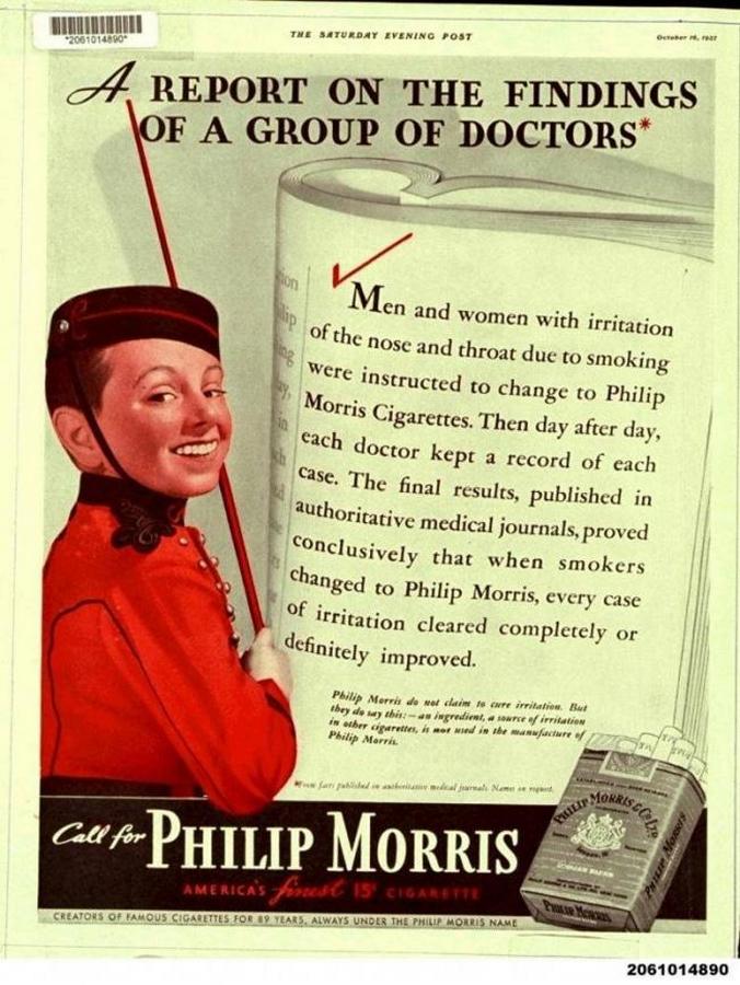 Обратите внимание на ключевую убеждающую фразу над рекламой: «итоговые результаты, опубликованные в авторитетных медицинских журналах, повсеместно подтверждают, что после перехода на сигареты марки Philip Morris, раздражение слизистой полностью прекратилось, либо были замечены значительные улучшения».