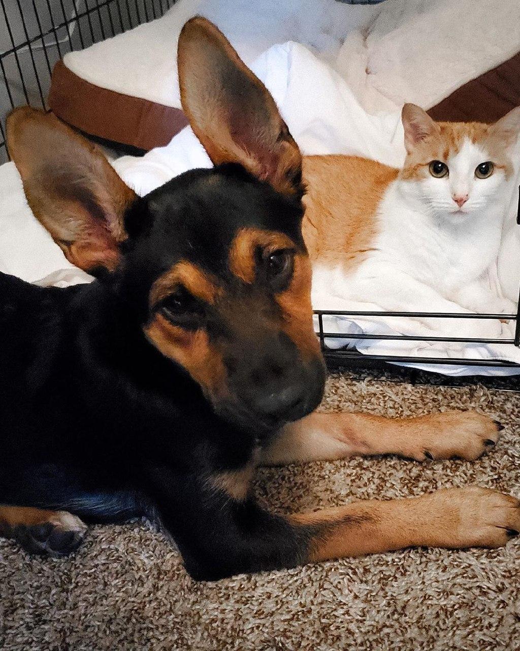 Моя дочка тоже недавно взяли из рескью. Немецкая овчарка с доберманом (предполагаем глядя на уши). Нашли на помойке 3 щенков. Но у нее еще маленькая, 3 месяца, звать Зина Хena. У нее уже своя страница в инсте есть.