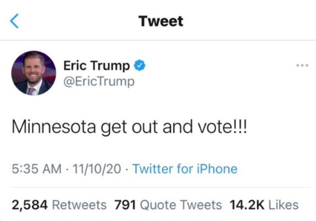 The Trump sons are currently going at full steam with the line that the Democrats somehow stole the 2020 election for Joe Biden, and all that tweeting and Instagramming is clearly starting to wear on them. Eric Trump even seemed to either mix up a scheduled tweet or briefly forget where he was in the space-time continuum when he urged Minnesota to “get out and vote” early this morning, one week after Election Day. He deleted the tweet minutes after posting, but Twitter got the screenshot. Сынок, тебе папаня сказал, что выборы 23 ноября ? Вот и жди. Еще на Байдена гонят, что он ничего не помнит. Тут вся семейка потерей памяти страдает.