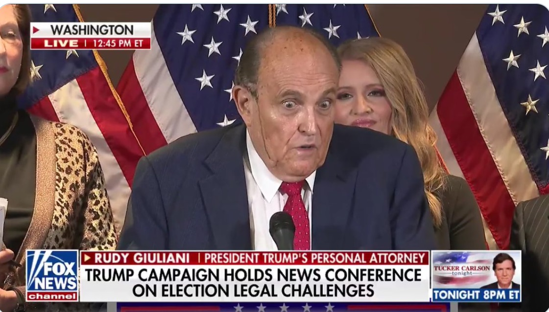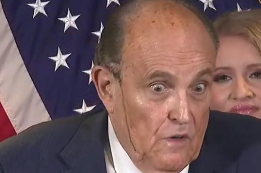 Rudy Giuliani wasn’t looking too good Thursday at his regularly scheduled election fraud press conference where he began sweating to the point that it appears his hair dye (we’re hoping) was melting down his face. He also reenacted a scene from one of his “favorite law movies” My Cousin Vinny and called the entire city of Philadelphia corrupt in between the usual claims of election fraud without presenting any real evidence.