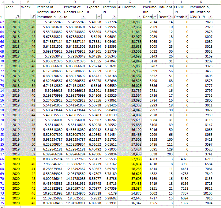 Везде говорят, что кол-во кейсов растет и мрут пачками. Ok. Открываем цифры с сайта СДС и смотрим all death понедельно. Сравниваем с аналогичным периодом прошлого года и с весной, пикчи цифирь прилагаются. По сравнению с прошлым годом разница небольшая. А если учесть, что с ростом населения и смертность тоже увеличивается (цифры есть на сайте CDC), то в течение последних месяцев получаем ну очень небольшое увеличение смертности по сравнению с прошлым годом и огромное снижение по сравнению с весной. Да, вирус есть, серьезный, люди умирают, но весной была общая смертность до 78 тысяч в неделю, рекордно высоко, а сейчас 57 тыс. +/- , что очень близко к доковидной.