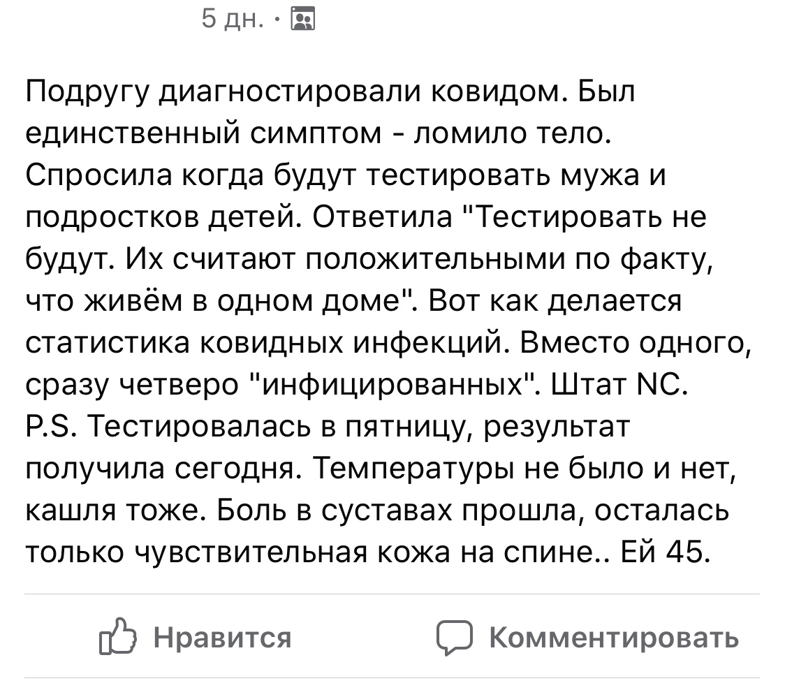 Я всеравнок скептически отношусь к российской статистике. Но хоть такая. Лучше всего жить в северной Корее, и Туркменистане - там статистики нет и ковида нет. У меня другие данные . Как раз наоборот . У меня подруга в Москве живет в девушкой которая работает в скорой помощи . Они вместе снимают квартиру на двоих уже много лет . Говорит - Короновирус притягивают за уши, всем. Я это вижу на форумах и слышу от знакомых . Сейчас на моем мамском форуме , девушка сказала что даже в поликлинике на двери написано что все орв будут записаны как корона в больничный лист и историю болезни. Родственница моей родной сестры , по отцу ,Она болела пневмонией весной - в мае , им предложили 30.000 р за то что они согласятся с диагнозом корона в карте бабушки - той было 70+ Лет. Тесты не подтвердили корону. Это практикуется абсолютно везде . Учитывая что тесты 50/50 , для увеличения видимости числа заболевших , вот такой херней занимаются.