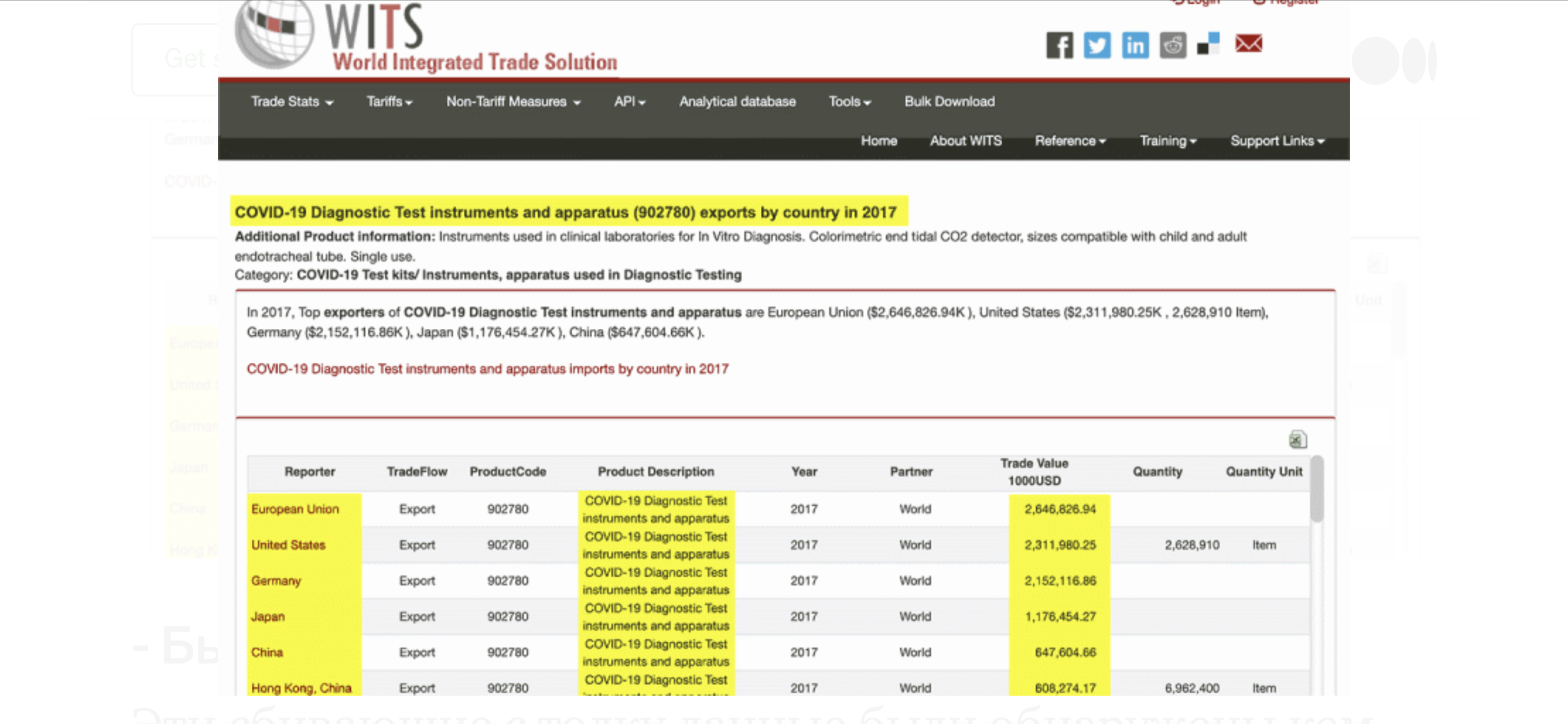 2 Миллионы тестовых наборов COVID-19 были проданы в 2017 и 2018 годах Как известно, новая болезнь КОВИД-19 появилась в Китае в конце 2019 года. Поэтому он был назван COVID-19, что является аббревиатурой от Corona Virus Disease 2019. Однако данные Всемирного интегрированного торгового решения показывают нечто удивительное: “в 2017 и 2018 годах-за два года до COVID — 19-по всему миру были распространены сотни миллионов тестовых наборов для COVID-19.”