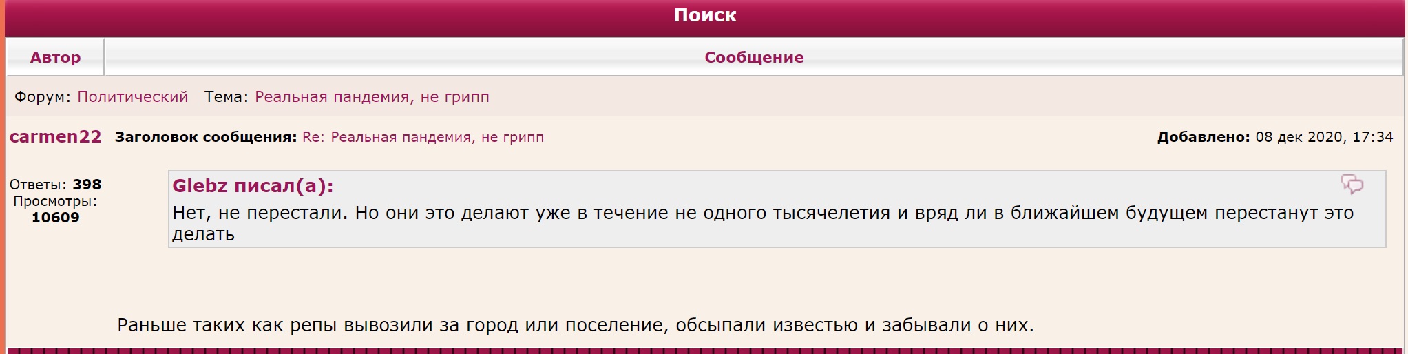 carmen22 писал(а): Найди мой пост. Он не стерт и не отредактирован (как твой) и поставь тут. Где я это говорила ? Иди налей себе еще, а то мелишь всякую фигню и сочиняешь. Модераторы твою террористическую дичь наутро стёрли. Но форум-то прочитал и запомнил. Нажралась и написала такую гнусь.