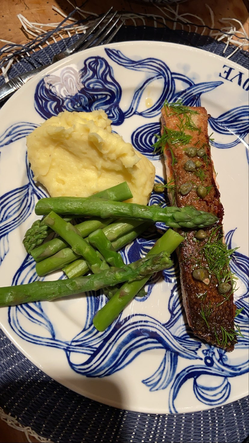 Мое фирменое: salmon in bourbon glaze and asparagus with cheese, garlic and cherry tomato. 35 мин и все готово на стол.