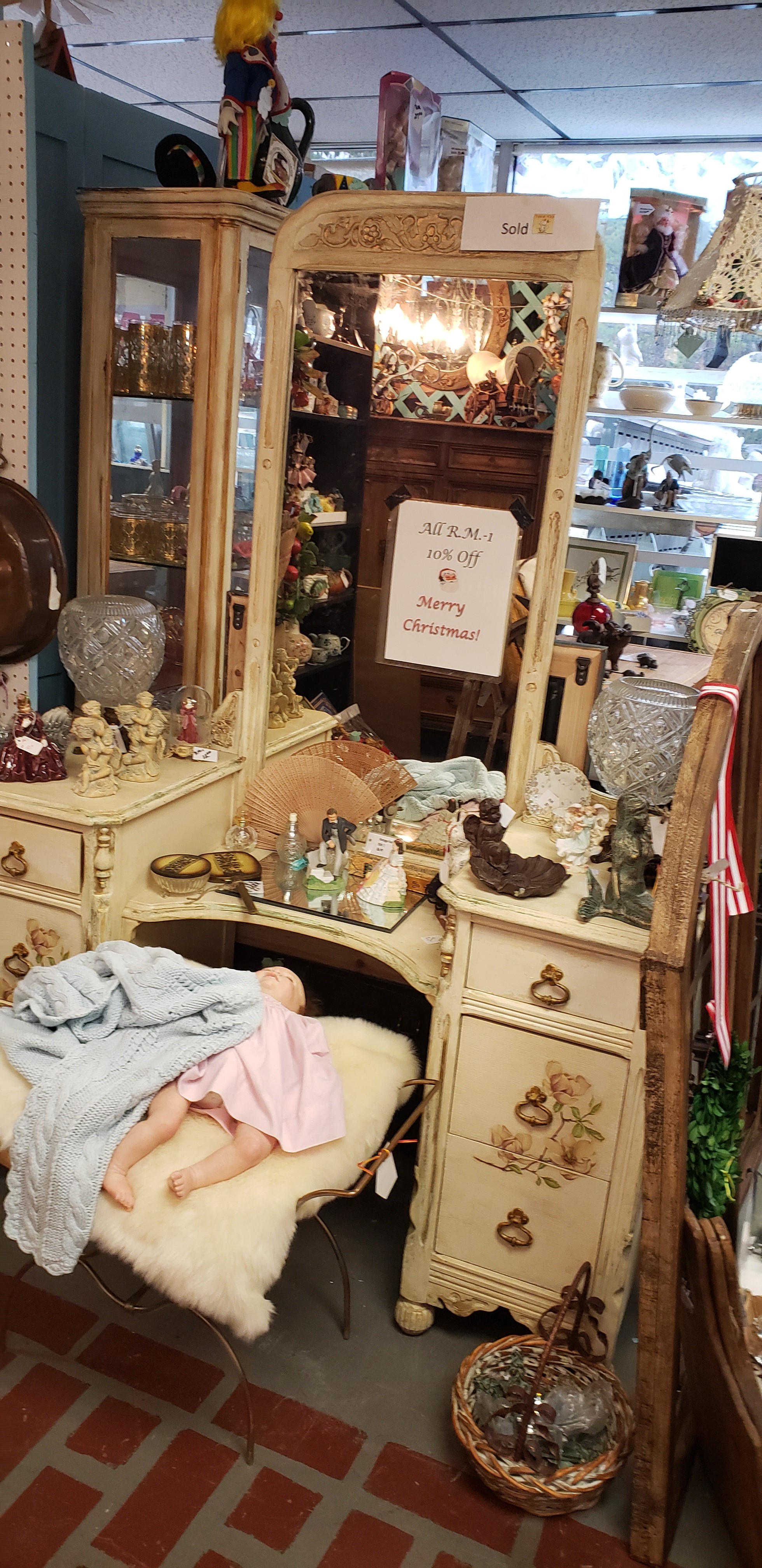 Младшее дите, как оказалось, любитель старины. Вернулась она в пятницу из антикварного с подружкой, взахлеб c восторгом рассказывает о vanity, что ничего ей в жизни больше не надо, кроме него, и что детям останется, и просит, и копытами стучит, фото показала. Пока ее дома не было, мы в субботу съездили и купили это втихушу ей в подарок на Рождество. Сегодня я не смогла отвертеться, она потащила меня туда уговорить меня это купить, а оно оказалось sold. Рыдания продолжались 3+ часа, я устала больше, чем сама рыдающая. Этот vanity сейчас у соседа в подвале до Рождества. Все еще успокаиваемся. Не дождусь теперь Рождества после всех страданий. Вот оно: