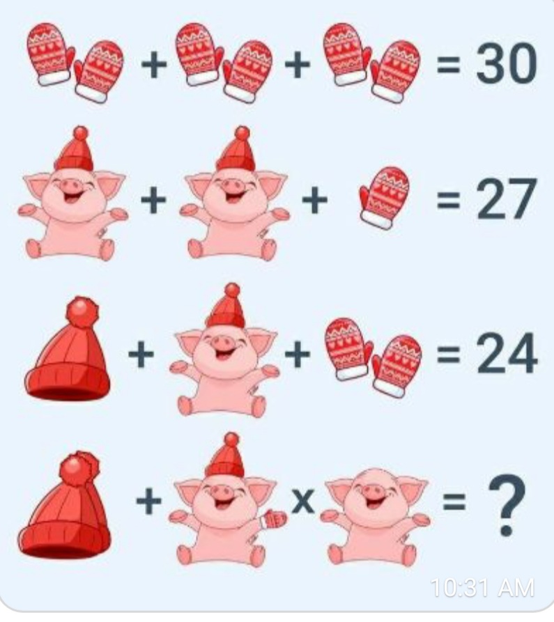 134 ? Не увидела сначала варежку на поросенке и что шапок две . Ну если еще считать , что большая шапка в два раза больше "весит " ? Хммм , а как вы считали ? Исправила . Пардон , неправильно в уме посчитала сначала .