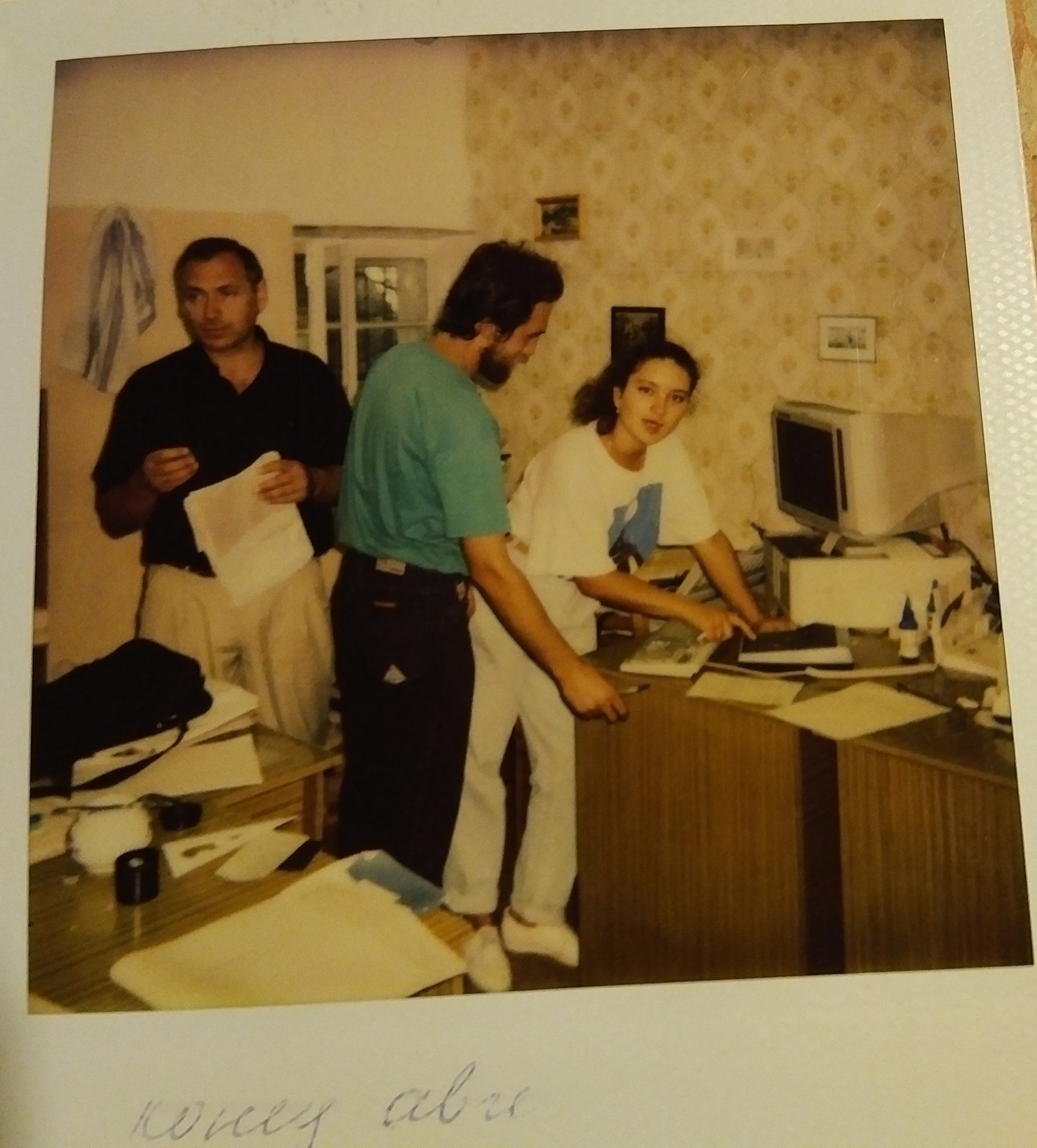 Вот, нашла фотку поляроидную в этих самых бананах - на моей второй в жизни работе. На первой я несколько месяцев всего проработала. Это уже даже не 80-е, а 1992, скорее всего. Джинсы я те все еще носила  А футболка была привезена аж из Англии моим другом по переписке - слеш неудачливым и несостоявшимся бойфрендом Дейвидом  Про него историю я как-то уже писала. Но футболки, что он привез, я носила - пока они до дыр не распались. Одна была черная, с мюзикла "Фантом ов опера" - со светящейся черепушкой. Вторая, - которая на картинке, - была из какого-то фонда защиты животных, с пингвином. Очень хорошего качества, кстати, были футболки. Но, главное, - они были кул, прямо их Англии! Ни у кого таких не было