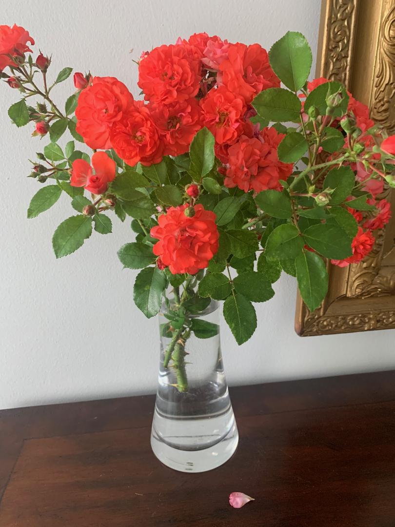 Клубнику не попробовала, слизни всю слизали. Волмартовские $5 гладиолусы зацвели. Мелкие,но все ж я довольна. И розочки срезала из вазона .