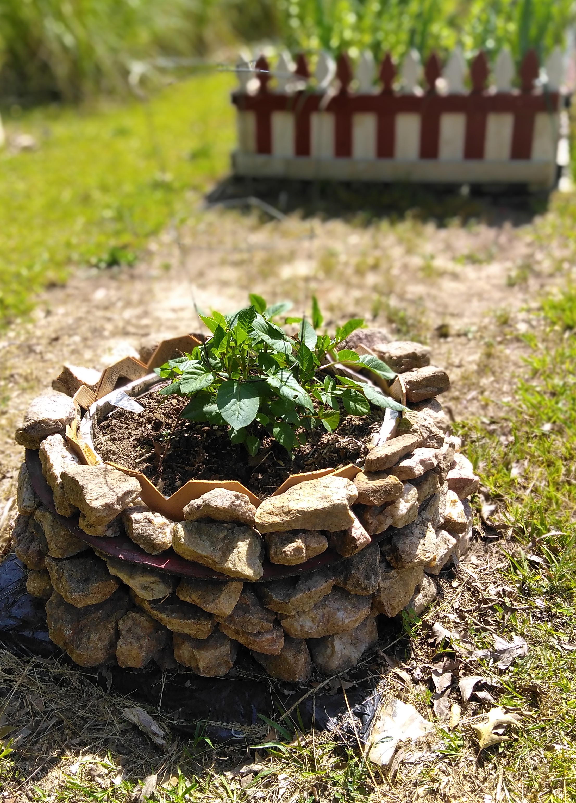 там не бочка, но бочку тоже можно таким макаром обложить. Там связанные проволокой две разрезанные пластиковые штакетницы для удержания формы, потом разрезанные кофейные пакеты, чтоб земля не вываливалась, потом земля. дно мусорными мешками проложено , чтоб ни деревья ни травища не пришла об$едать мои цветочки -помидорчики. Камни собирались заранее годами, так что было не долго все это собрать вместе.