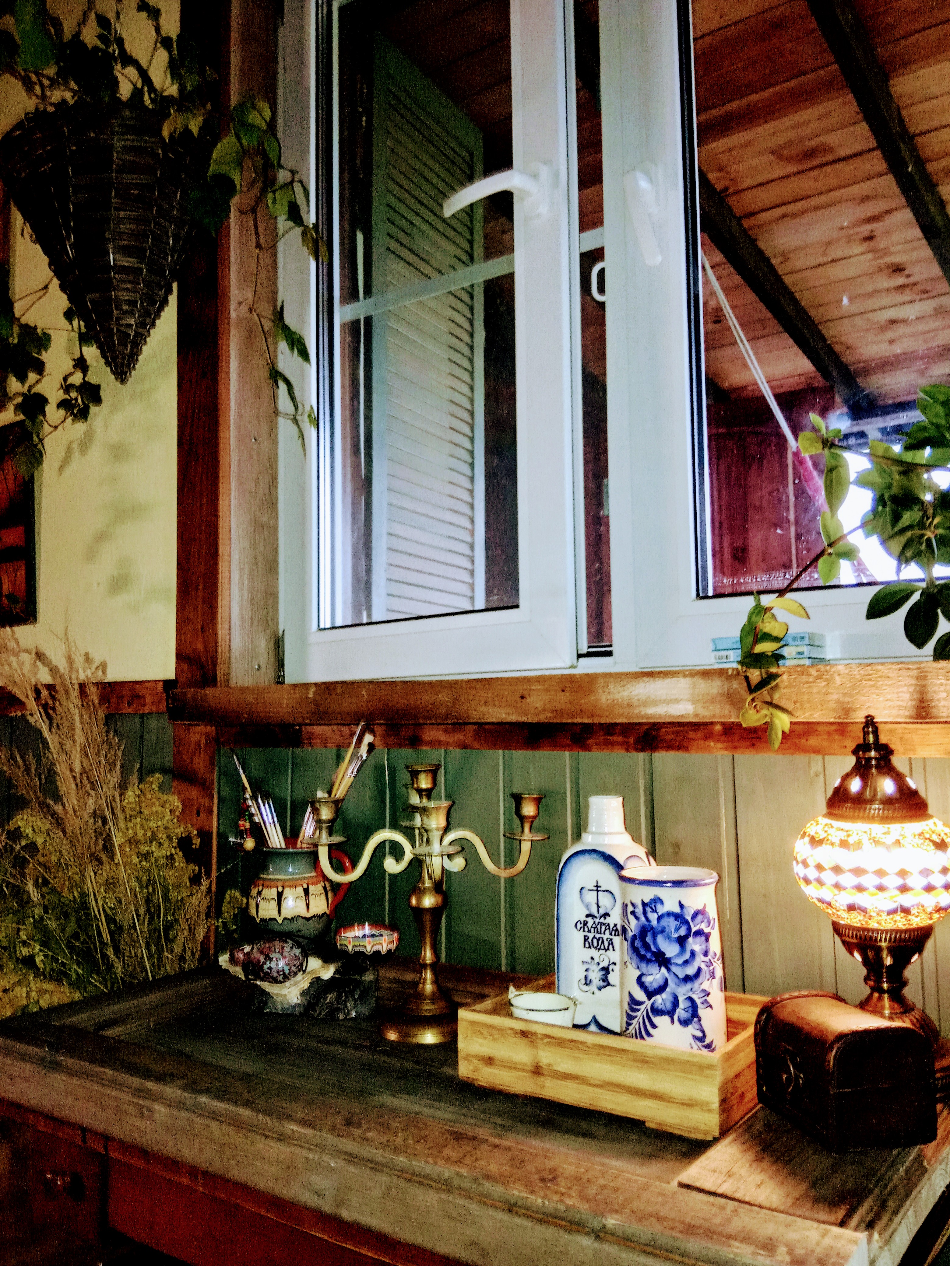 Соорудила себе уголок, "уголок писателя" типо..) Окна белые не нравятся, не подходят они мне вообще. Делаю на них раскладку, жалюзи деревянные и штору, все лучше будет. И можно будет сидеть зимними вечерами с коньяком и ждать прихода музы:)