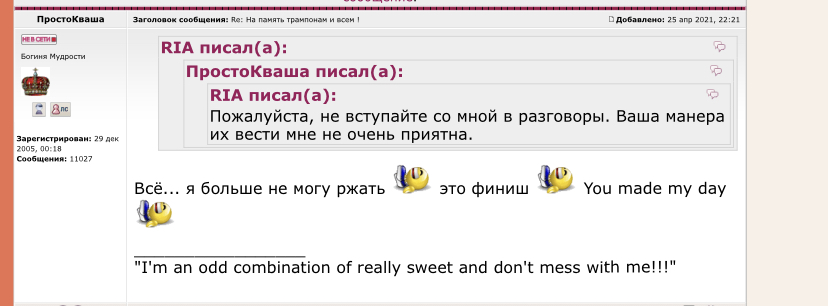 RIA писал(а): Я так понимаю, что Квашу мой ответ не удовлетворил потому что не отвечает ее восприятию самой себя - белой и пушистой. Я белая и пушистая до тех пор, пока на меня не наезжают. Поэтому " не пиздите, а то улетите".
