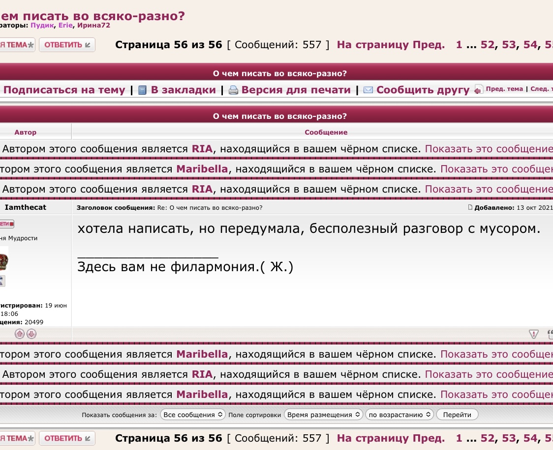 Iamthecat писал(а): на этом все. Пишу, чтоб уже безвозвратно. Ощущение, как окунаюсь в помойное ведро при посещении. Написала, чтобы уже не заходить. Я вас понимаю, да, у меня тоже было такое ощущение иногда, сейчас я просто перестала с ними общаться, есть спасение от агрессивных троллей - перевод их в полоски , я захожу на форум только залогиненной и красота, -видишь их сообщения случайно и редко, как -будто их почти больше здесь нет... Так что, выход из положения есть В любом обществе есть опустившиеся деградировавшие люди, увы, наш форум не исключение Вот так выглядит для меня форум сейчас, например )))