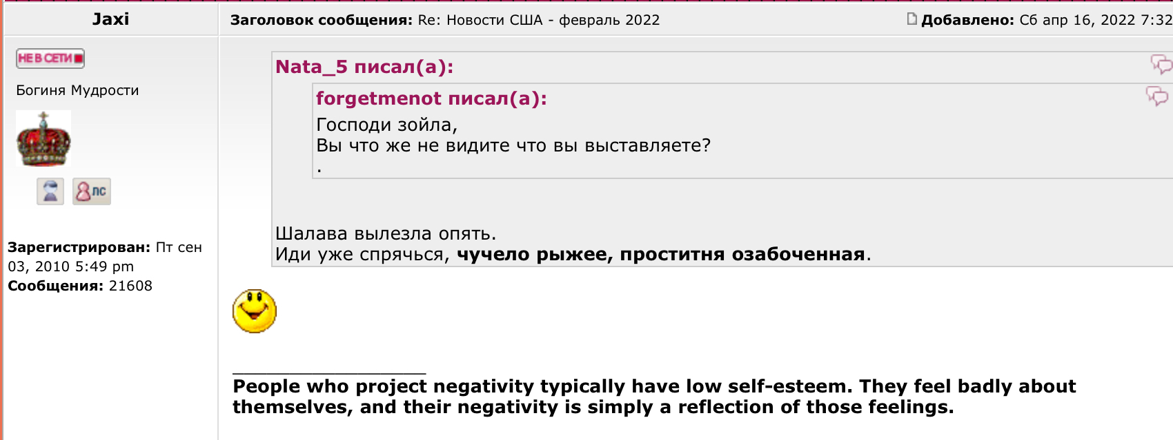 Olimpiada77 писал(а): На этом форуме вы оказались не просто так. Ваша задача давить и запугивать оппонентов, оскорбляя их самыми грязными словами и даже объявляя участников форума сумасшедшими. Вы давите дискуссии и буллите участников форума во всех темах одновременно 24 часа в сутки, все это видят невооруженным глазом. Правильно, таких как вы и взрaстил Сорос, выделив вам щедрые гранты. Я называю вещи своими именами, если вам мерещится везде рука Сороса, то этому лишь одно объяснение, что вы ментально не здоровы или просто недалекого ума. Я, Вам, посоветовала навести порядок в вашей голове и попробовать хоть как то образовываться. Вы осуждаете правых экстремистов Азовцев, ну в то же время голосуете за Трампа который спонсирует правых экстремистов и нацистов как Boogaloo Bois и Proud Boys , и отказываетесь видеть, что подобные экстремистские нацистские группировки есть в любой стране, ну никому в голову не приходит развязать войну с другим государством лишь, потому что там есть националисты- они есть везде.