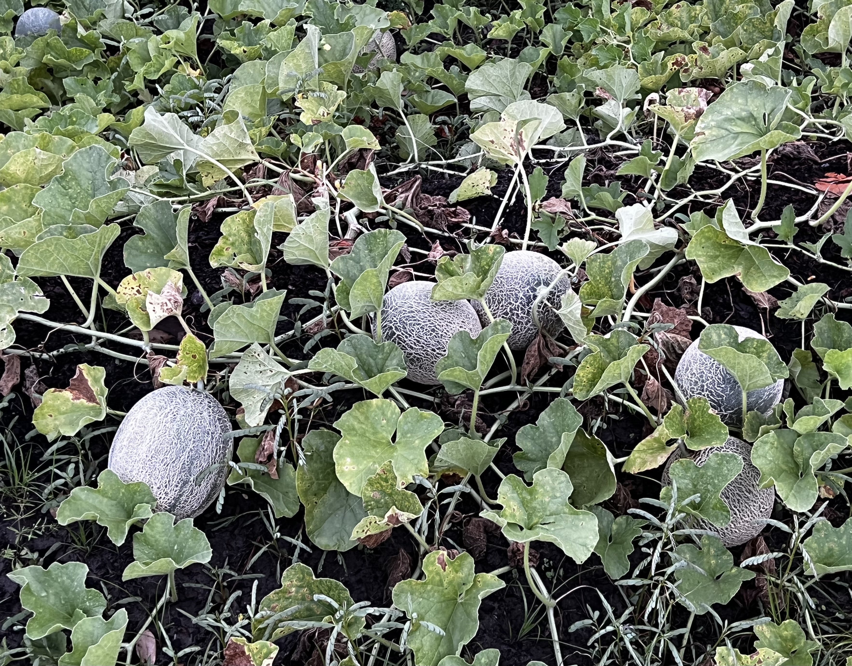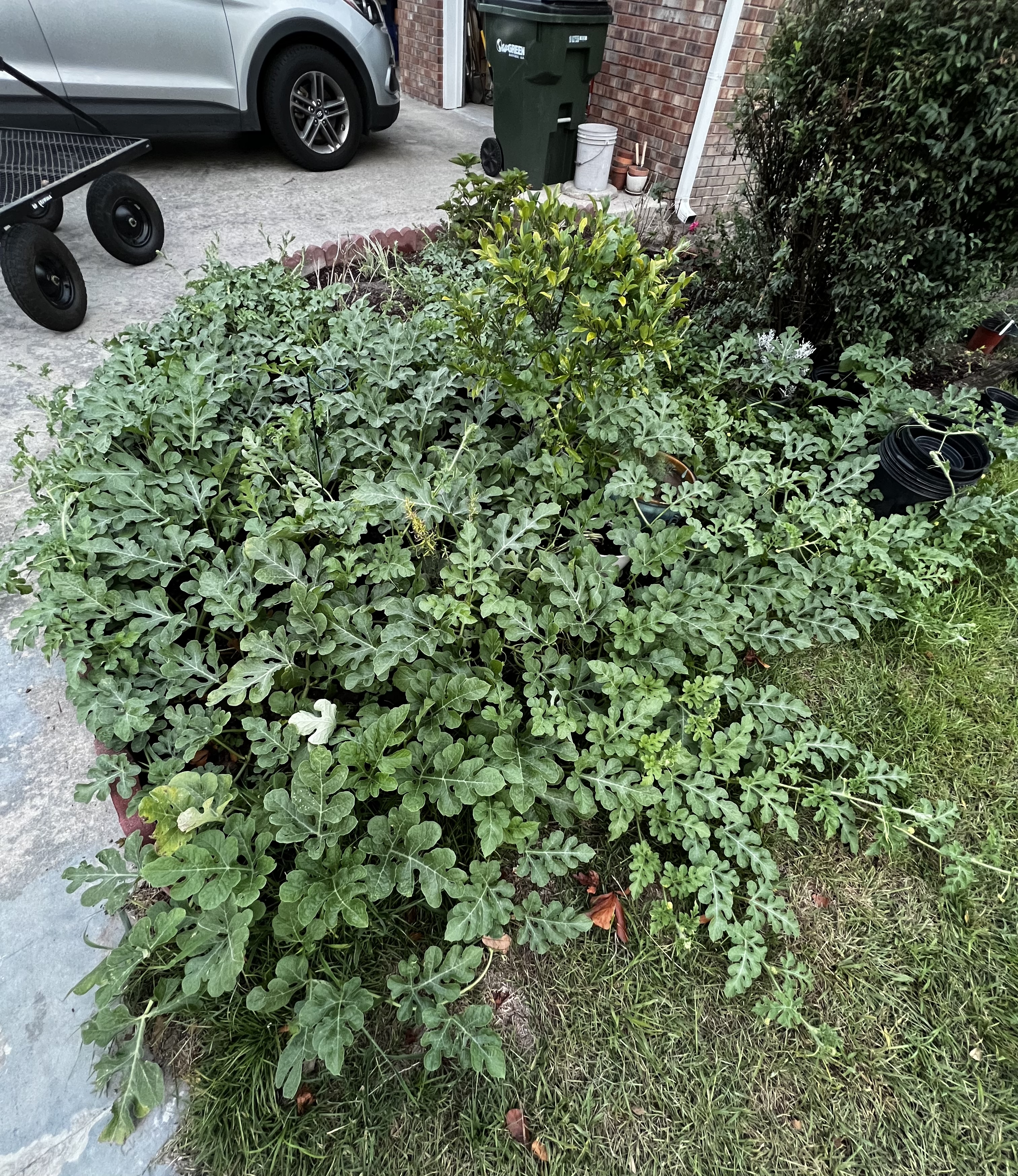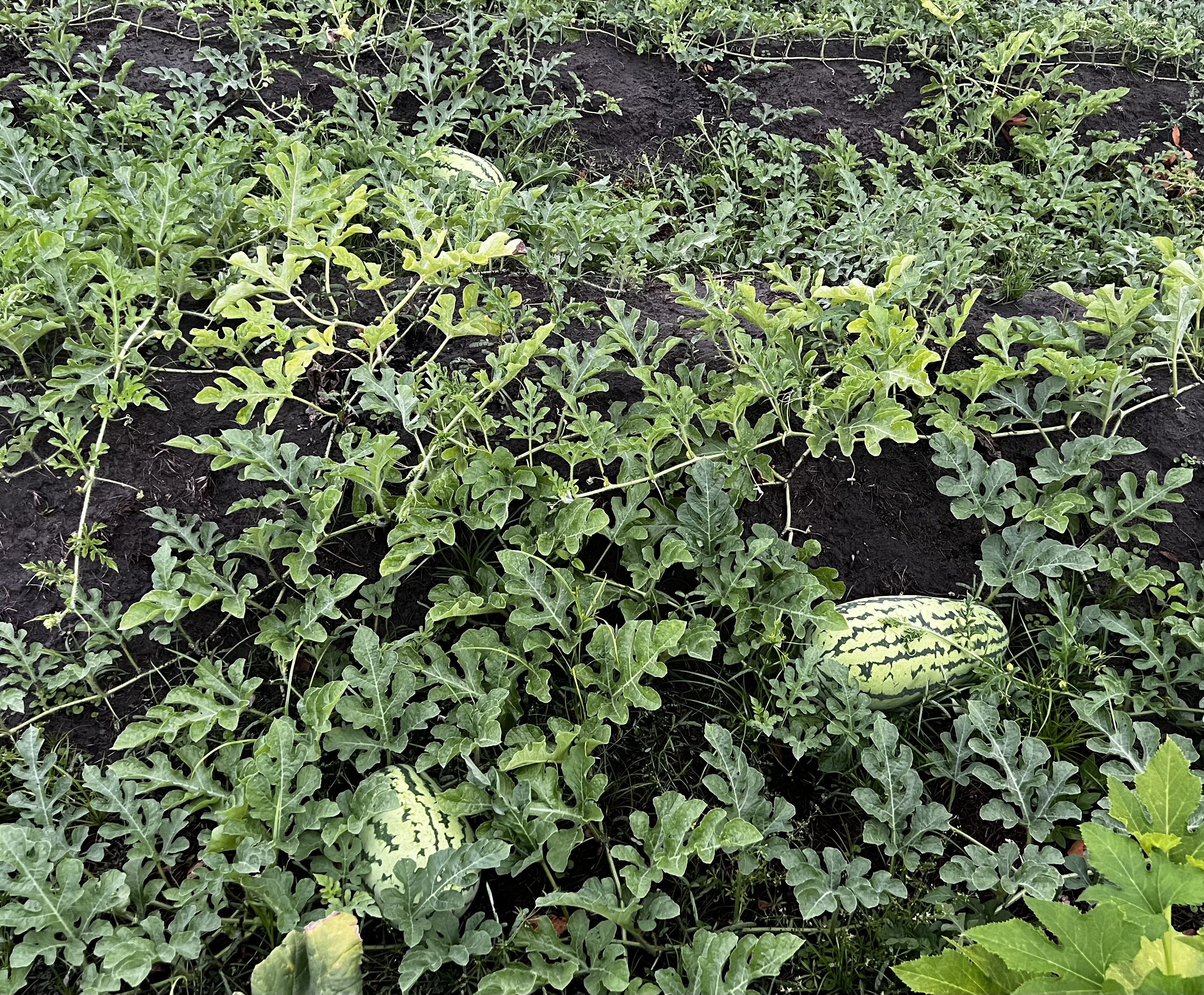 Вот это один арбуз. Заполонил все, случайно попало семечко на стык между грядкой и драйвеем. Вот ещё- арбузы и дыньки: