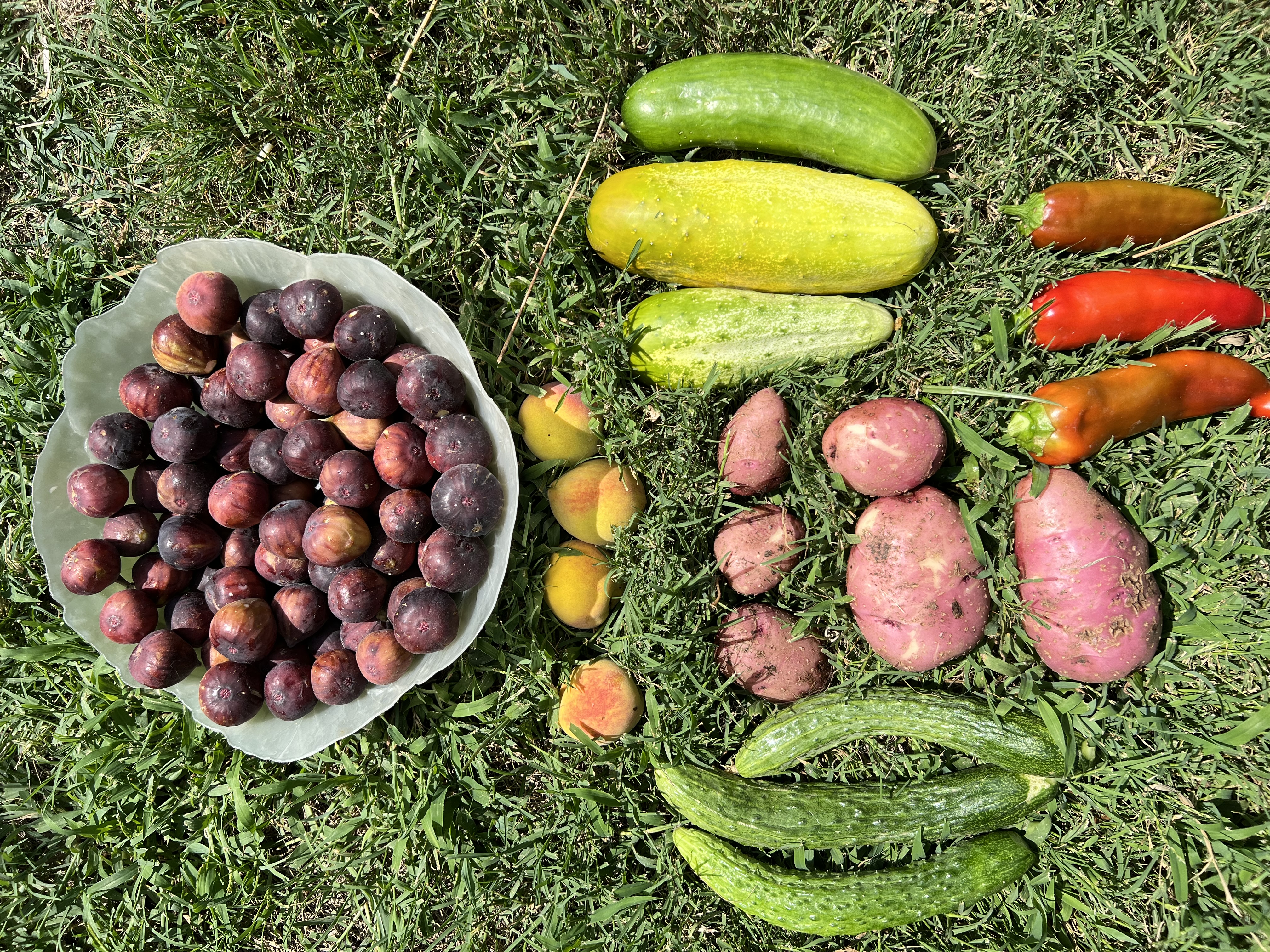 Персики белки растаскивают, фиги птицы склёвывают, помидоры, перцы кто-кто надкусывает, картошку кто-то подгрызает, а огурцы вроде никто не трогает.