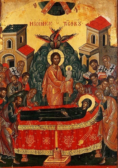 На иконе Успения Пресвятой Богородицы мы видим, что Она изображается благолепно распростертой на Своем смертном одре, а рядом с ней стоит Ее возлюбленный Сын Господь наш Иисус Христос, Который держит на руках Ее пречистую душу. Когда-то Матерь Божия держала Иисуса еще Младенцем на Своих пречистых руках, сейчас же Господь Ее душу как младенца, новорожденного в новую вечную жизнь, принимает на Свои руки.