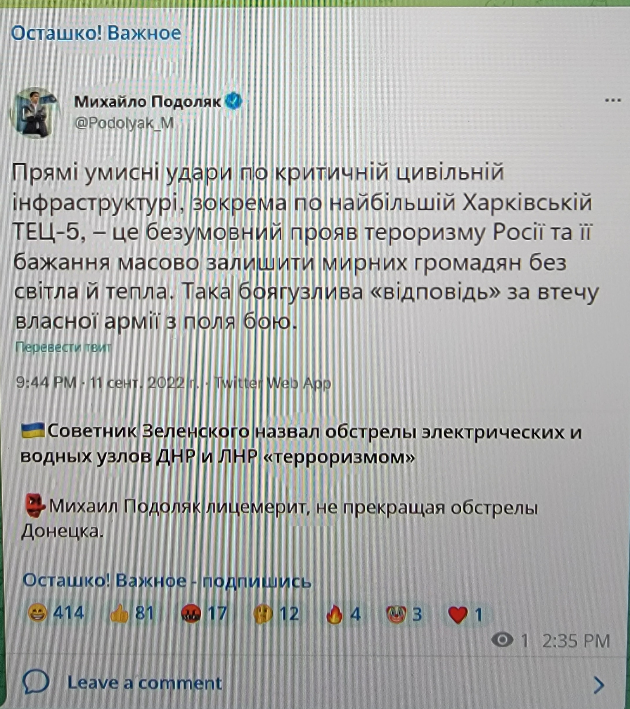 2. А теперь следим за руками. Сегодня Россия отключает ЗАЭС, что уже убирает из энергобаланса Украины почти 1 Гиг мощности. А потом, вдруг удары по Харьковским двум ТЭС, которые вместе с отключкой ЗАЭС кладут на лопатки энергосистему восточной части Украины. Зачем это Киеву, лично я не понимаю. Зачем это Москве, понимаю и очень хорошо. Таким образом Москва поясняет Киеву на понятном тому языке, что на каждую хитрую лису, есть гайка с левой резьбой. И если они не прекратят шалить в вопросе ЗАЭС, то будут они постоянно пояснять своему населению, почему оно сидит без света.