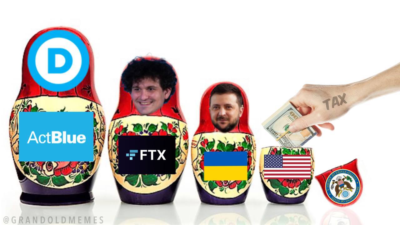 Американцы уже рисуют коррупционную матрёшку года: ActBlue (Американская некоммерческая организация, собирающая деньги для демпартии) - FTX (Криптобиржа, разорившаяся накануне, оставившая клиентов без миллиардов долларов и уже обвиненная в выводе денег с Украины) - Зеленский - Помощь США Украине