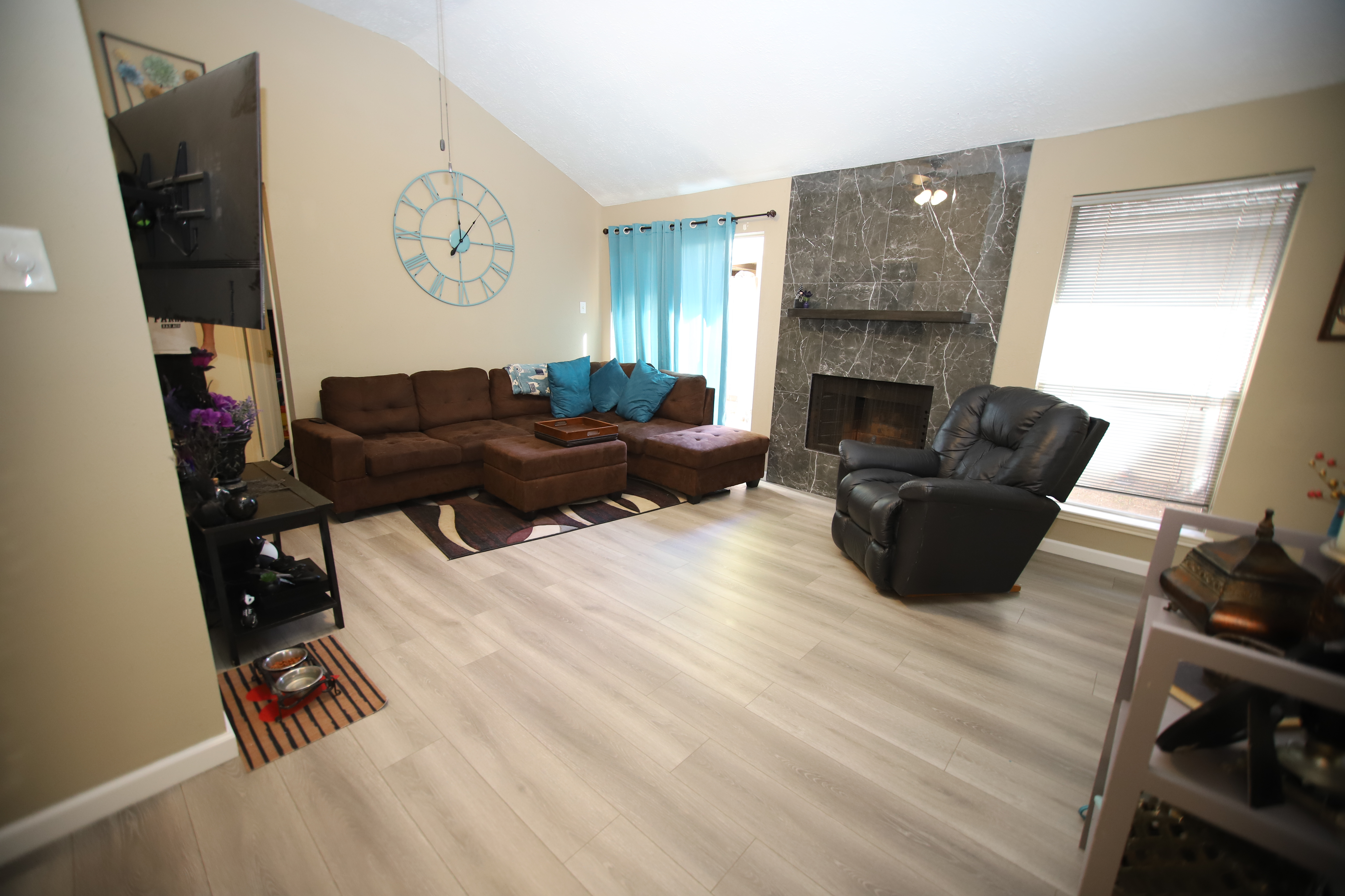 камин получился очень здорово... вам надо окна только дооформить чтобы создать разные текстуры, слоями. Можете погулить дизайн окон,но вкратце надо палки для штор поднять под потолок, повесить тяжелые шторы, и сверху между палкой и окном роман блайндс (можно фальшивые). Мелочь, но это работает очень классно. Будет 3 слоя, если жалюзи считать. Панели (обязательно блэкаут берите если надумаете менять) и так чтобы закрыли кусок стены между окном и мрамором и роман блайндс цветом можете поиграть в разные варианты. Текстиль сразу уюта добавит и будет классно с глянцевой поверхностью. И ковер слишком маленький для вашего мягкого уголка. Если такой размер нравится, то надо чтото вроде шкуры коровы, это очень модно сейчас, многие дизайнеры используют. А большие ковры по правилам берут чтобы связать группу мебели... я не занудничаю, просто камин дает потенциал сделать, это фокус, вокруг него уже надо плясать. перечитала, вроде бред получился а не совет...  ... короче, вот вам картинка - я наспех прилепила шторы, чтобы понятно было...если такие шторы нравятся, они были на распродаже в ВендВ, по 19 долларов за панель. Я себе купила, потому что они очень хорошие. Вот они сейчас по 50 долларов, может будет еще какая нибуть распродажа перед Рождеством. https://www.bedbathandbeyond.com/store/product/quinn-medallion-blackout-grommet-window-curtain-panel-single/5386315