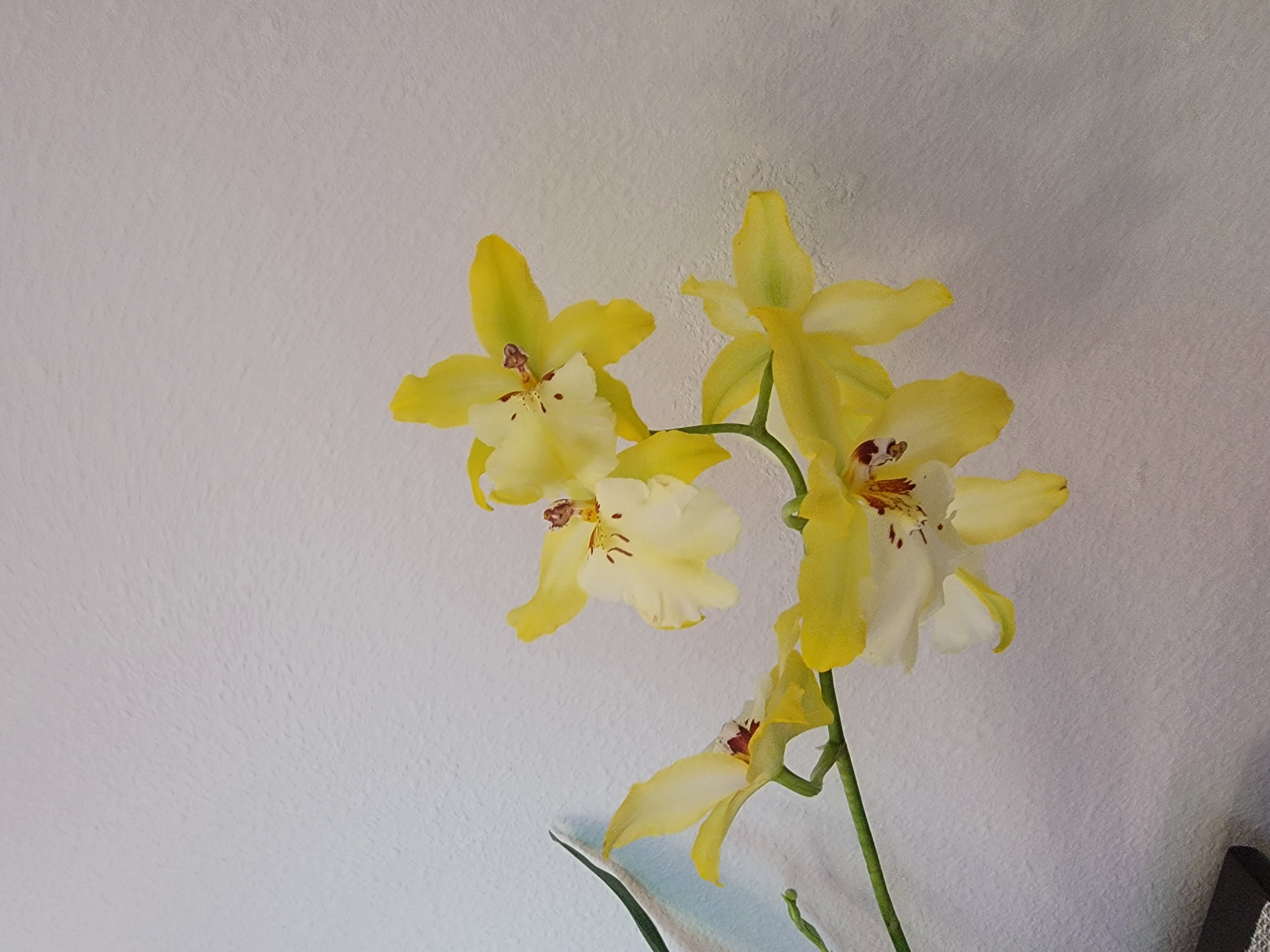 Пересадила нового циню (онцидиум) в вазу. Сначала не хотела его покупать, но муж уговорил. А теперь довольна... ведь хорош!