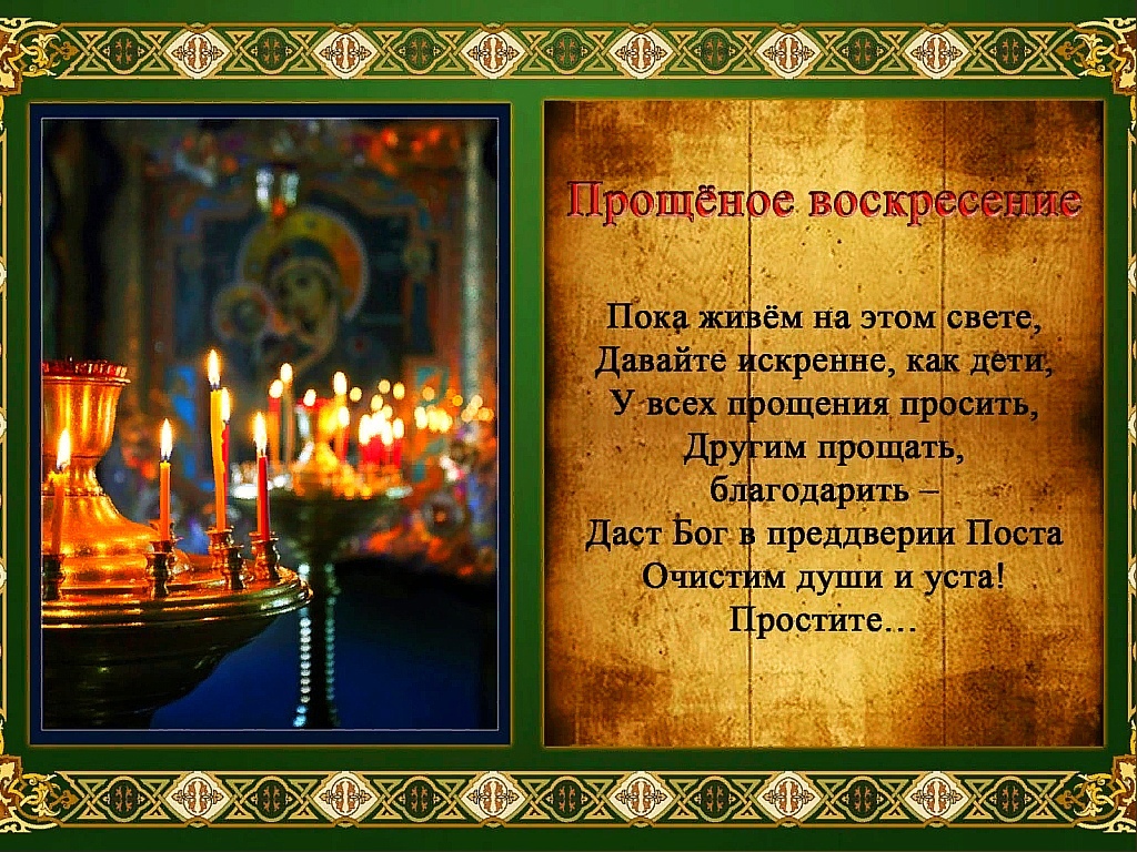 Братья и сестры, будем же всепрощающими и милостивыми, снисходительными к проступкам ближних, ведь и у нас есть свои грехи, о которых мы просим прощения у Бога в Прощеное воскресенье.