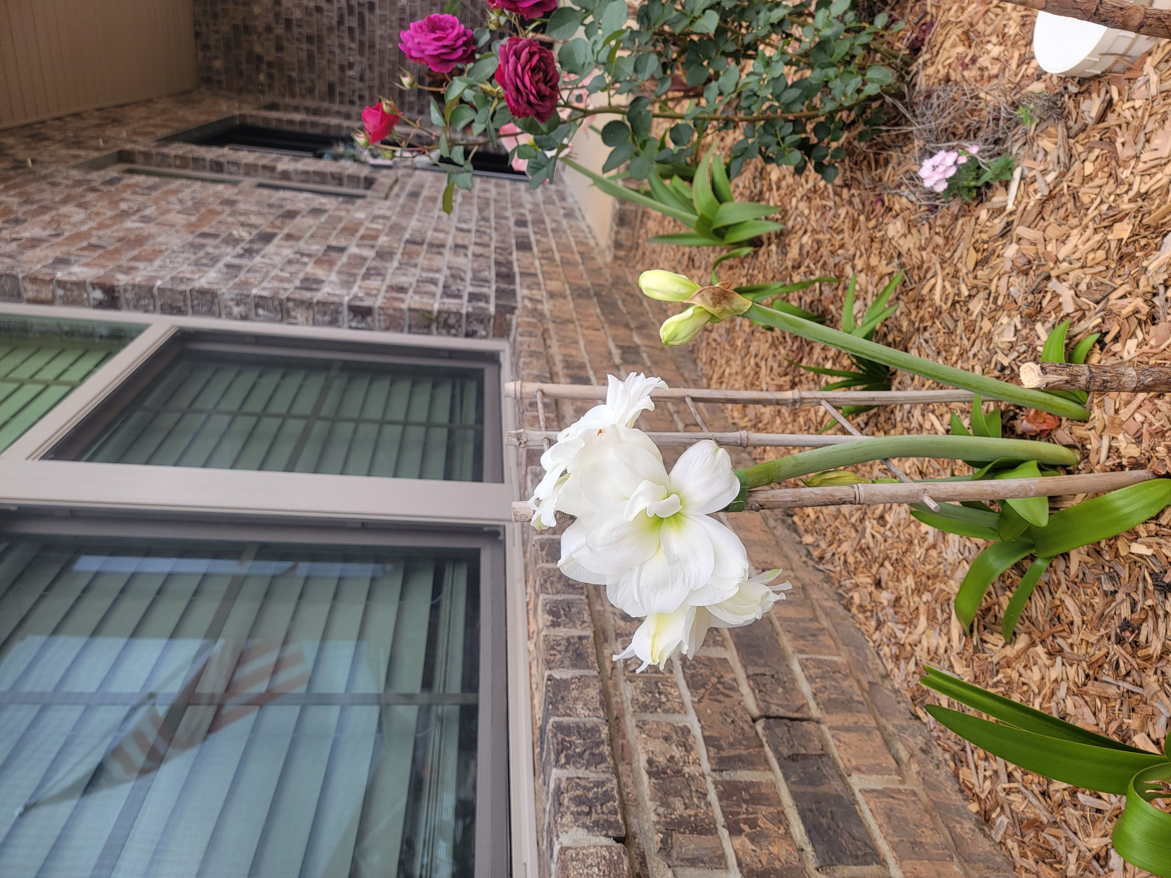 Белый "пошёл"... Утром смотрю- лежит цветонос на земле... 3 цветка из 5ти бутонов распустились, и все... слег. Пришлось опору устанавливать