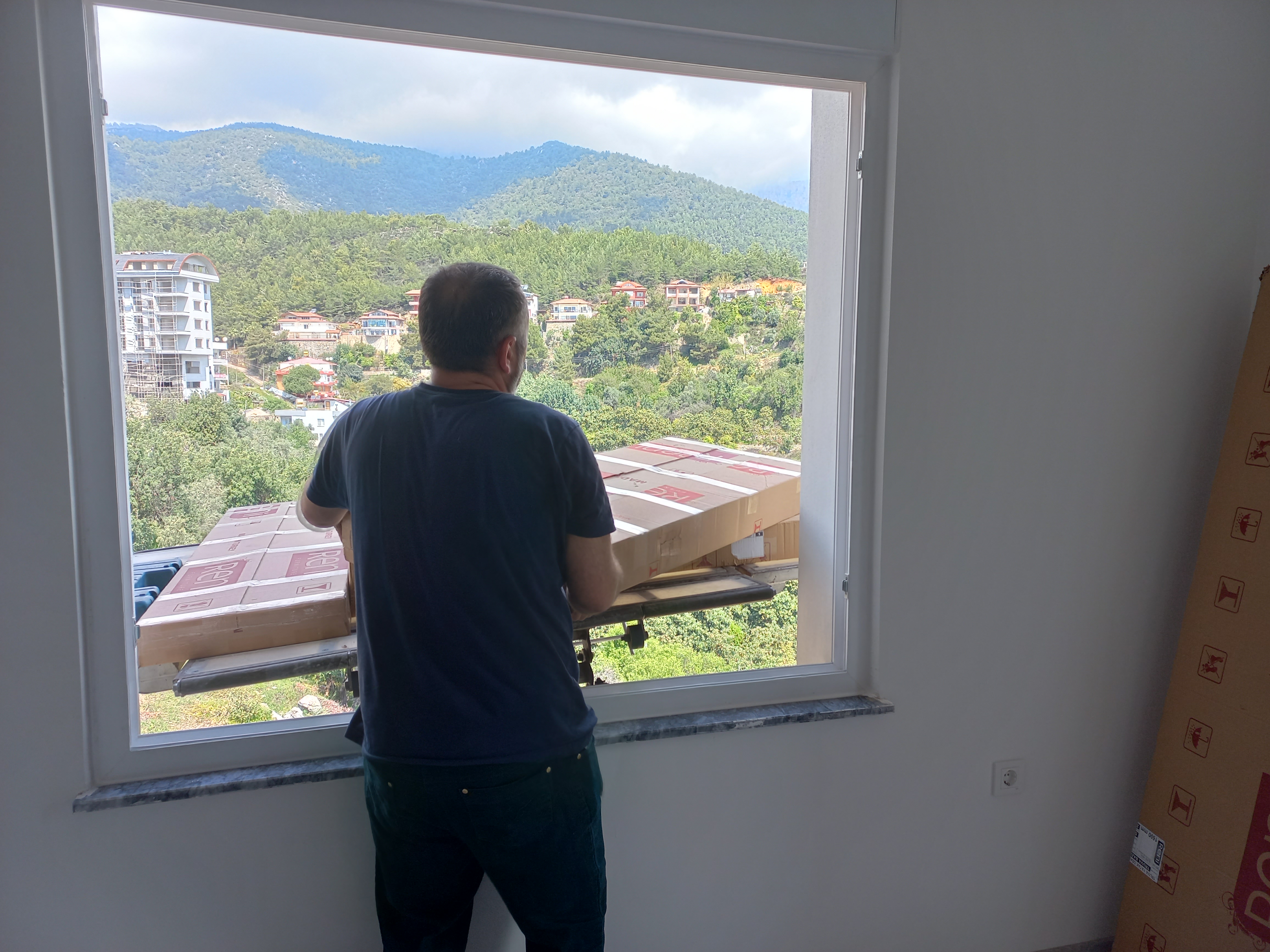 У нас сняли окно, все доставили по этой лестнице-лифту. Матрас так въехал, огромный угловой диван в двух частях и мебель с кроватями, шкафы - все -все! Молодцы какие! А у вас лифт в доме есть? Есть! Но его еще не подключили. Через неделю сказали подключат. Но по лифтам тут никто мебель не перевозит. Именно таким вот способом и ввозят мебель. Вчера нам вымыли квартиру от стройки, и завтра будут устанавливать все остальное. Довезут кондиционеры и холодильник, остальное все стоит. Сегодня приезжал оценщик на предмет остекленения балкона, цену пока не назвал, только замеры сделал. Как то все двигается со скоростью улитки, но хорошо что двигается. Над нами последний пятый этаж, над нами такой дуплекс двухэтажный!!! По сути двухэтажная квартира. Если бы у меня было 240К свободных, я б его прямо сейчас купила. Там больше места, два шикарных балкона. На тот дуплекс у меня наличных не хватило, а покупается тут все сразу, таких ипотек как у нас нет. ЭХ! Самое любимое место у меня будет кухня и балкон, я уже знаю что и как у меня будет. Кухня небольшая, но уже в нее влюблена, я там жить буду :-))