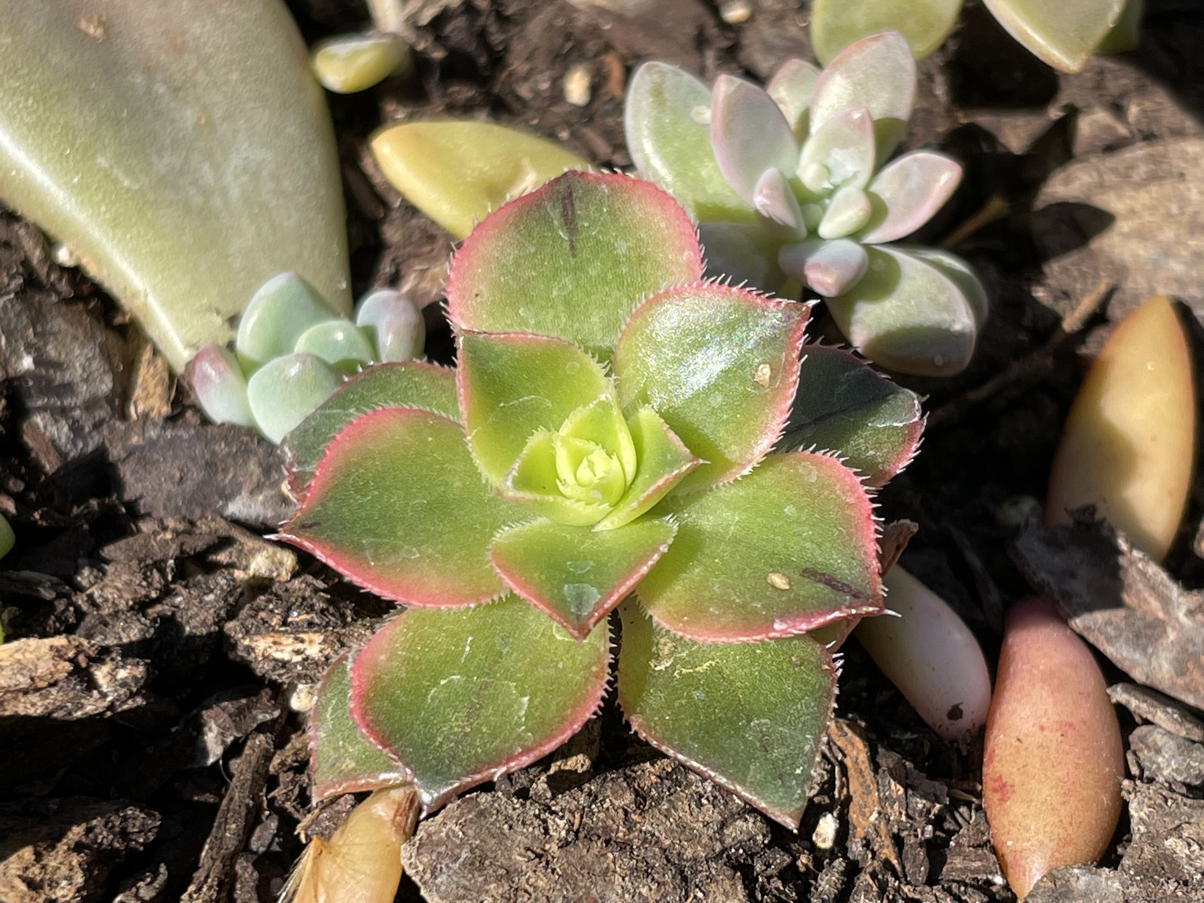 Бейли,ну где твои эониумы? Вот мои. Но пока ничего впечатляющего. А ведь они вырастают огого какие красавцы! Ну… может,у меня тоже получится  Названия не знаю, подарок. Пока растёт медленно,с прошлого года почти и не подрос. Киви,маленькая веточка. Киви,тоже был такой веточкой,но за зиму вырос. На фото он кажется меньше, чем на самом деле. Название есть,но надо рыться. Большой лопух,двойной,но невысокий пока тоже. Вот вчерашний, прям не смогла мимо пройти А это вот я не знаю,кто. Может,тоже какой элениум,но символики толстоваты и мясисты. Так,я,наверное,подписи перепутала. Ну, надеюсь,поймёшь)))