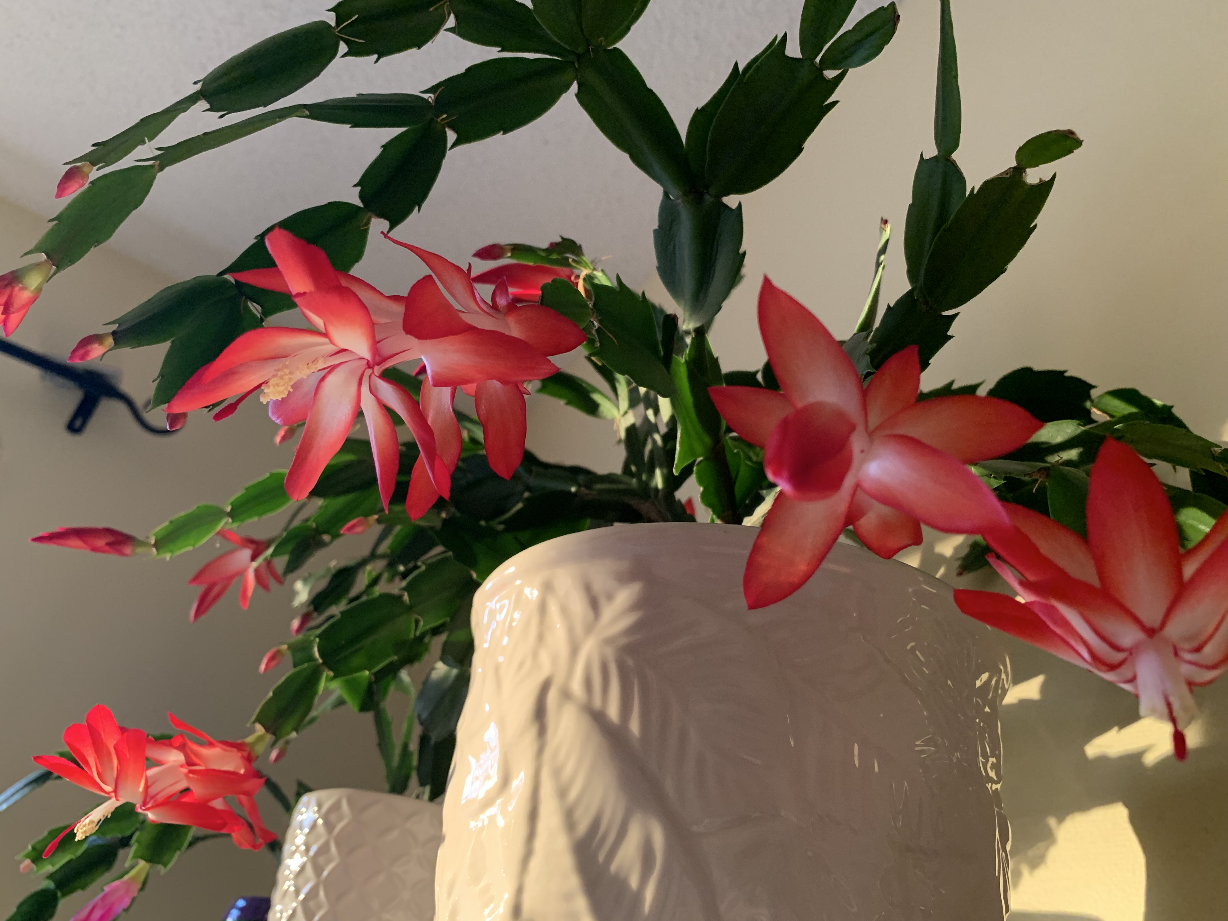 Почти в ночи выкопала одну из 4х пуансеттий. Запихнула в горшок. Очень даже ничего, боковая обрезка пошла на пользу. Еще не вся окрасилась... поставлю на фронт порч, пусть народ радует. Единственное, осень была жаркая, и я ее недополивала. Поэтому листья далеко неидеальные. Ну, учту на следующий год.