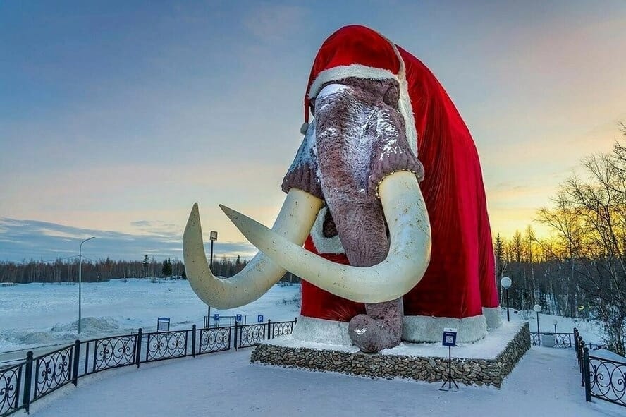 САЛЕХАРД - город, построенный на вечной мерзлоте. Единственный в мире город, стоящий на Полярном круге. Одно из любимых местными жителями сооружений - 10-метровый мамонт Митя на берегу Оби. Митю любят, Митю берегут, Митей гордятся. К каждому празднику ему дарят интересный наряд. К Чемпионату Мира по футболу он носил шарф болельщика, в пандемию - защитную маску. А к Новому Году он становится Дедом Морозом. И вообще мамонт редко бывает "голым". Сроднился он с городом, прижился.