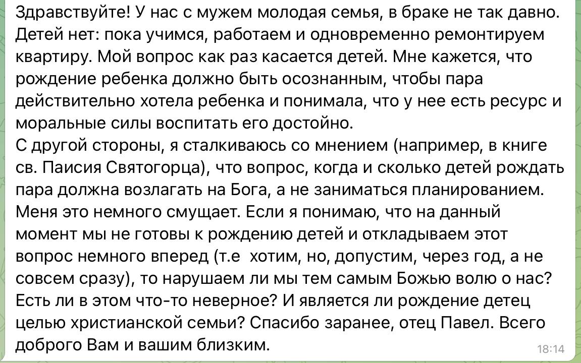Рождение и воспитание ребенка - это процесс, который длится около 15 лет на одного ребенка. Каким образом вы сможете быть готовы морально и материально к подобному подвигу, когда никто из нас не знает, что будет даже завтра? Основой для рождения ребенка является вера в Бога, вера друг в друга и желание совместно трудиться над решением любых проблем, которые есть сейчас, которые будут завтра.