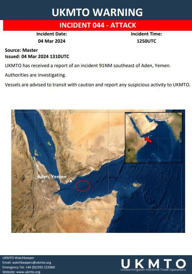 Центр морских торговых операций Великобритании сообщает о новом «нападении» на судно в 91 морской миле к юго-востоку от Адена, Йемен.