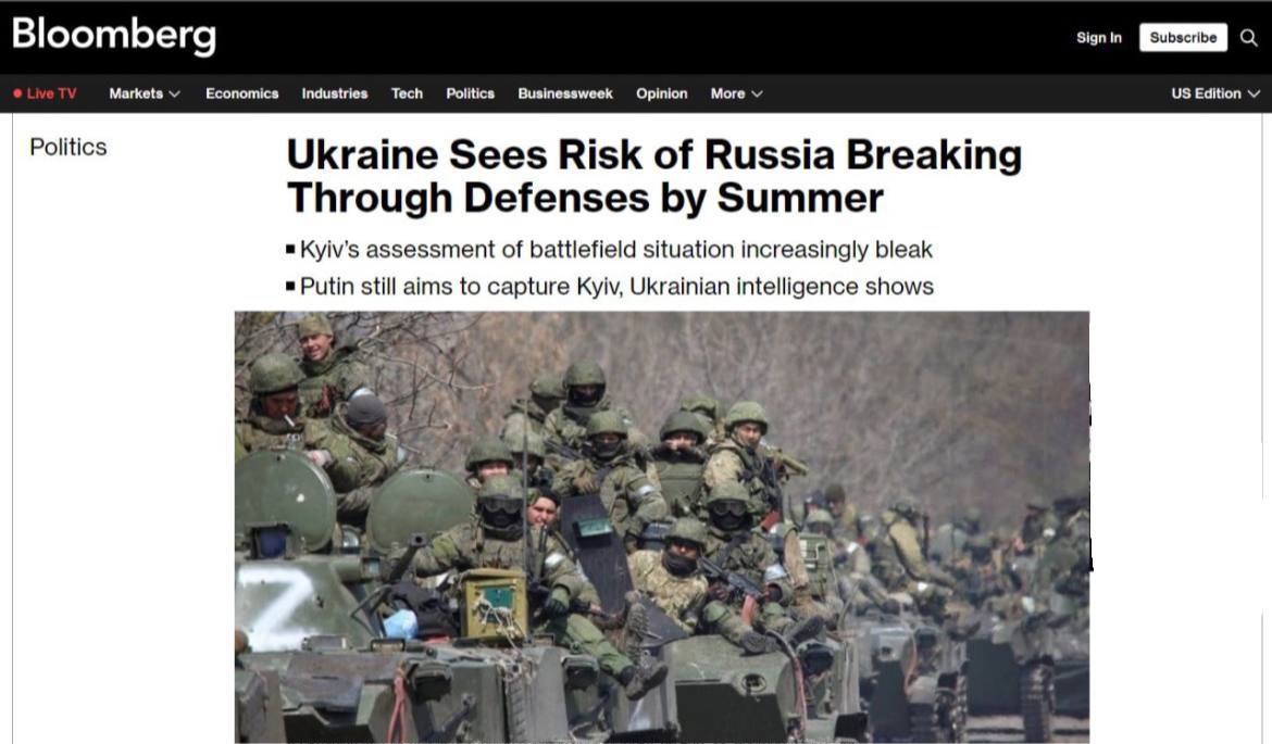 Россия не отказалась от своей цели взять большие города, включая Киев и Одессу, - Bloomberg