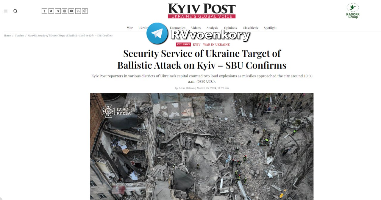 ▪️Украинские СМИ со ссылкой на источник в спецслужбах сообщают, что целью сегодняшних ударов по Киеву было здание СБУ. ▪️Как мы сообщали ранее (https://t.me/RVvoenkor/64615), сегодняшние ракеты достигли своих целей. В результате удара было полностью разрушено трехэтажное здание в центре города. (с)
