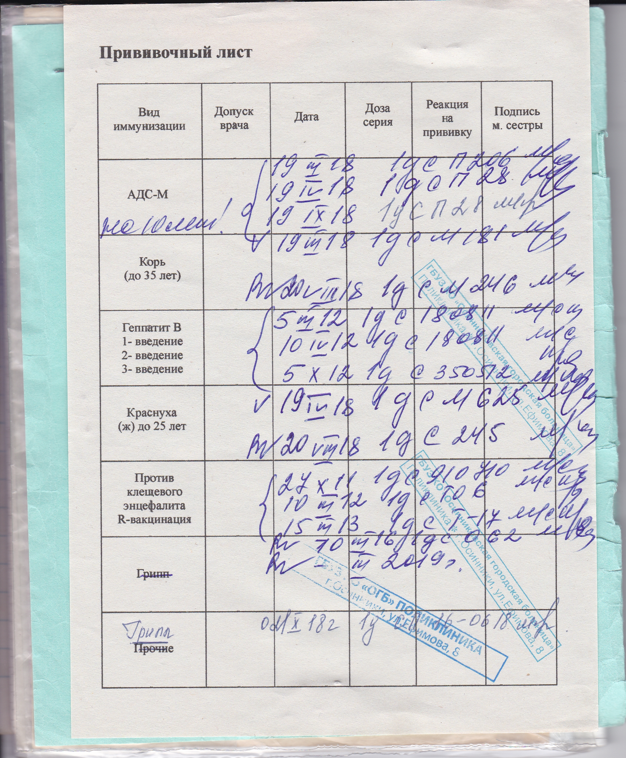 alla144 писал(а): instructor писал(а): последняя дата АДСМ? 10.09.2013? а справка выдана августом 2013-го? проясните этот вопрос. А так - всё есть. Только грипп нужен. Справку мы получили в мае 2018, когда забирали мед.карту с прежнего места жительства в другом городе. Сегодня ходили в мед.центр к педиатру, показывали эту справку(учетную карточку) о прививках. Да, АДСМ сделана 10.09.13. Спросили, можно ли сделать сейчас, и получили ответ, что нельзя, т.к. существует Календарь прививок, где АДСМ по срокам в 14 лет. А девочке сейчас 12 лет и 1 мес. Т.е. нам нужен только грипп? Последняя проба Манту 7 мм, сделана в апреле 2017. Собираемся сделать ее недели через 3. Пропустили сроки в связи с переездом и пр. Не отразится ли это на тесте IGRA? Спасибо, Мария P.S. Я даже не обратила внимания на эти даты, там в справке есть ещё прививки за 2016 и 2017 год. Лучше переделать?