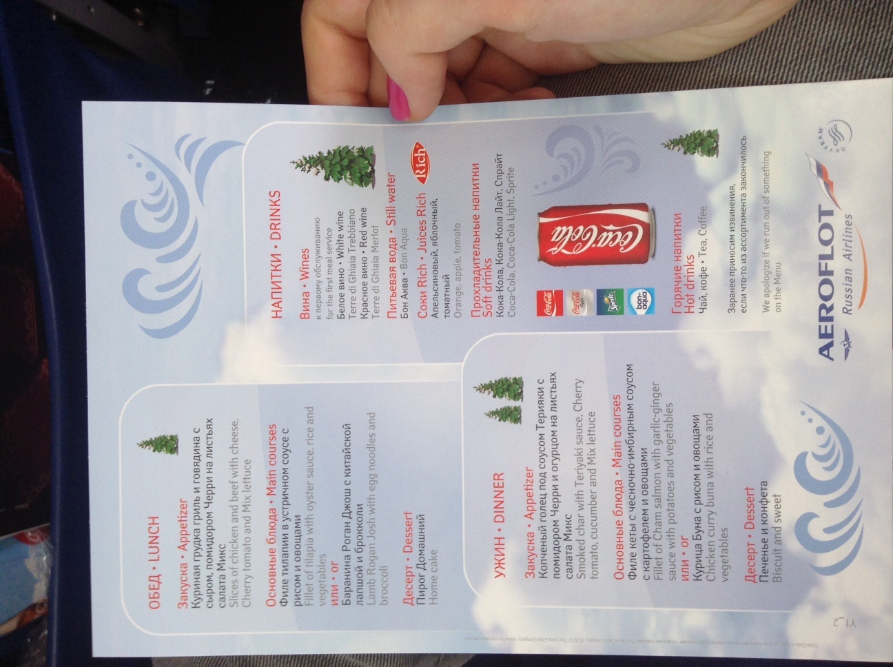 Девочки, привет из Вашингтона! :) вчера прилетела прямым рейсом Москва - Вашингтон Аэрофлотом. Перелет хорошо прошел, взлетели очень хорошо, кормили неплохо, только перелет занял 12 часов вместо 10, из за встречного ветра, иногда трясло ) Паспортный контроль я прошла за час после приземления, если бы не огромная лайн в красном коридоре, прошла бы за 15 минут. Офицер задавал вопросы прямо на контроле, нам казалось меня куда то поведут в отдельную комнату и будут допрашивать  в итоге, офицер вскрыл мой желтый конверт, внимательно изучал то что внутри, параллельно задавал вопросы: к кому приехали, откуда вы, чем в Москве занимались, когда др у вашего жениха Он пытался меня сбить с толку странными вопросами типа: "значит ваш жених работает с компьютерами? ) а он у меня ни фига не с компами работает) офицер забавный попался, много шутил :) ну и после этого отпустил с пожеланием хорошего дня )) Все хорошо, только вот погода меня вашингтонская не радует совсем, мой смеется, говорит: это ты холод привезла )) И вот, если кому интересно меню Аэрофлота на борту
