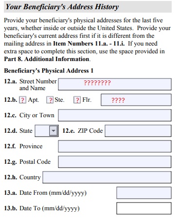 Есть Часть 1 - история адресов. Пункты 4-5 для 1го адреса, 6-7 для второго (заканчивается пунктом 7б). Дальше идет 8-9 - это отдельный ряд для последнего адреса за пределами США. Заканчивается пунктом 9б. Мне не хватило места, перехожу в Часть 7 - доп инфо. И тут нужно подписать: Номер страницы, номер части, номер пункта (айтем). Часть будет 1, а дальше - не понимаю( Адреса идут на странице 1, доп. часть для последнего адреса за пределами США вообще переходит на страницу 2. Если я напишу "страница 2, пункт 10а (следующий после 9го)", то такой пункт в анкете уже есть, и это уже не про адрес.