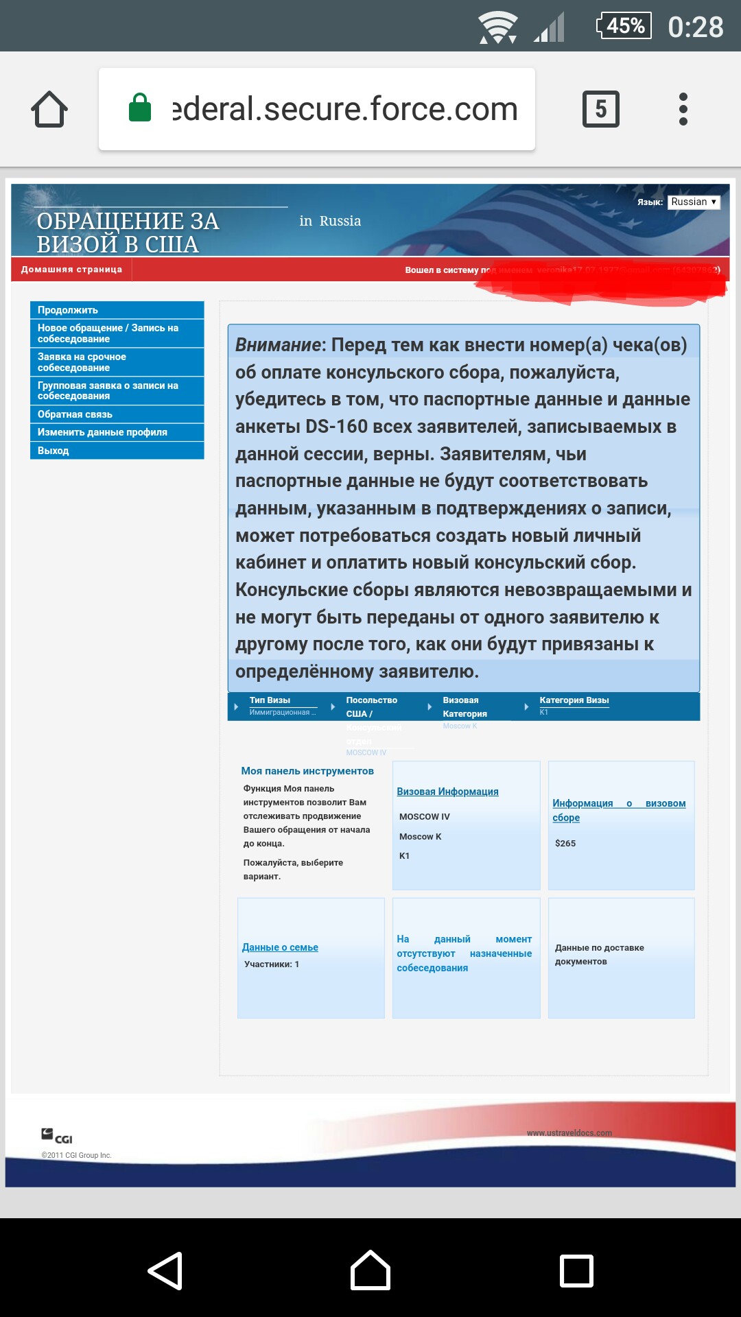 Поканевеста писал(а): Девочки, заполнил DS160, зарегалась на сайте где будет открываться календарь с датами 13 августа, отправила. Написано: " Ваш запрос на разрешение записи на собеседование получен и будет рассмотрен. В случае, если Ваш запрос будет утвержден вы получите подтверждение на ваш адрес электронной почты." Сегодня 15 число и ничего, написала в обратную связь, ответили что обновлено, заходите в систему. Зашла и все по прежнему. У кого так же было? Или у всех календарь открылся сразу? Привет! Мой опыт: 27 июля оплатила консульский сбор, 2 августа заполнила DS-160, закончила регистрацию на сайте (внесла номер DS-160 и оплату). Далее, как у тебя написано: "Ваш запрос на разрешение записи на собеседование получен и будет рассмотрен. В случае, если Ваш запрос будет утвержден вы получите подтверждение на ваш адрес электронной почты." Ответ пришёл в тот же день через пару часов. НО.... Когда НЕТ дат на интервью, тогда календаря-то не видно! Когда даты будут доступны, тогда на домашней странице в левом углу будет написано: Дата ближайшего собеседования.... (тогда-то). Чтобы узнать, открыт ли календарь/есть ли даты, надо кликнуть на: Новое обращение/Запись на интервью. И до конца кликай. Когда дат нет, будет написано: В данный момент нет доступных мест для записи на собеседование. Если даты есть, то откроется сам календарь. Обычно в день есть 5 попыток (если больше или слишком частая проверка, тогда система тебя блокирует и в конце будет написано подобное: Превышено посещение данной страницы, завершите в данный сеанс. Удачи! Я надеюсь, что понятно написала. В WhatsApp есть группа, для ловли дат. Если хочешь добавиться в группу, пиши мне. Кто желает - пишите. Администратор группы и участники, я думаю, будут не против.