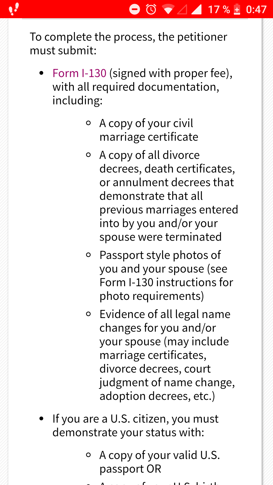 Ну как же нет, если в инструкции к I-130 сказано: you should submit one or more of the following types of documentation that may prove you have a bona fide marriage: (1) Documentation showing joint ownership of property; (2) A lease showing joint tenancy of a common residence, meaning you both live at the same address together; (3) Documentation showing that you and your spouse have combined your financial resources; (4) Birth certificates of children born to you and your spouse together; (5) Affidavits sworn to or affirmed by third parties having personal knowledge of the bona fides of the marital relationship. Each affidavit must contain the full name and address of the person making the affidavit; date and place of birth of the person making the affidavit; and complete information and details explaining how the person acquired his or her knowledge of your marriage; or (6) Any other relevant documentation to establish that there is an ongoing marital union. Вот документы для жен граждан на сайте юсикса для подачи петиции