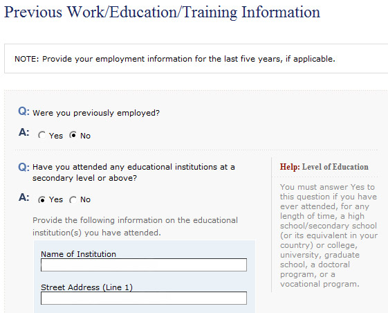 начала заполнять анкету на папу - а там ещё куча вопросов про работу и образование. 1) в вопросе про работу - указала текущую работу. на след странице надо указать прослыше работы. то есть если папа 10 лет на одной и той же работе - значит тут писать NO (см скриншот) 2) образование указывать всё всё кроме школы? просто папа много чего заканчивал. всё писать что ли? или тока последнее?
